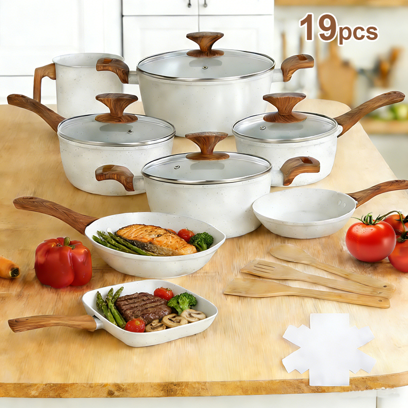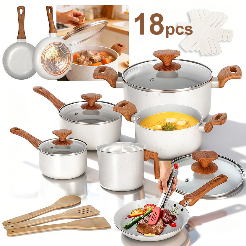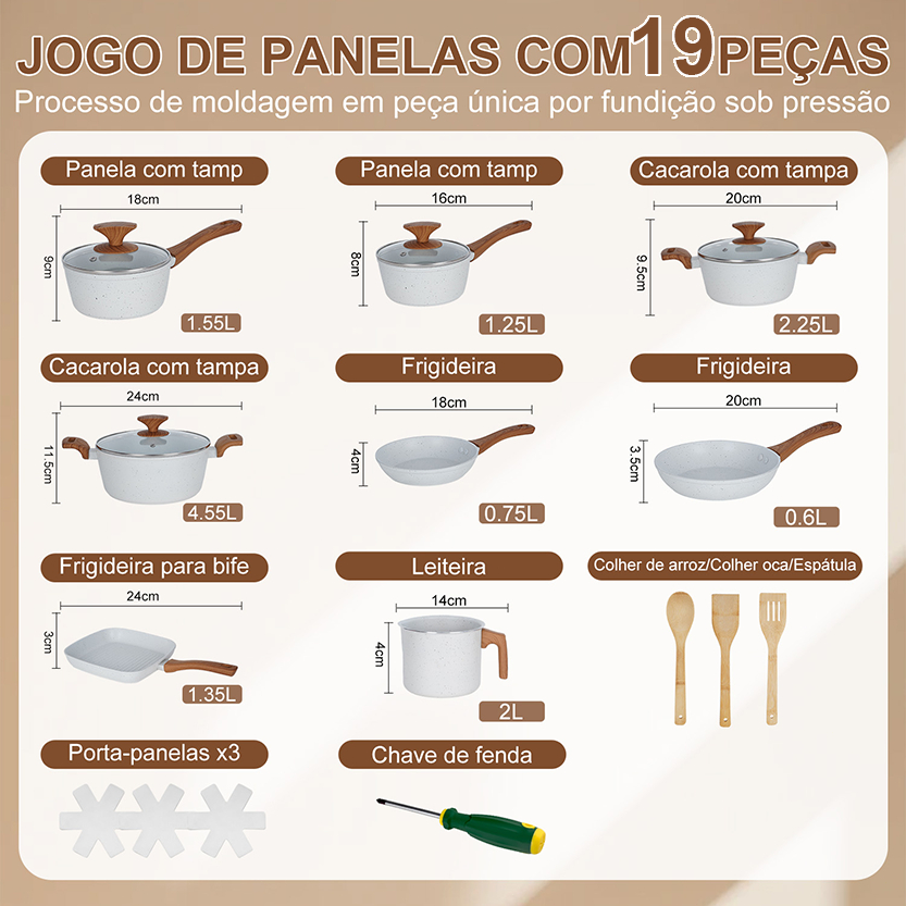 Nepul Jogo de Panelas 19 Peças Indução Gás Conjunto de Panelas Vanilla Antiaderente Frigideira Caçarola Alumínio
