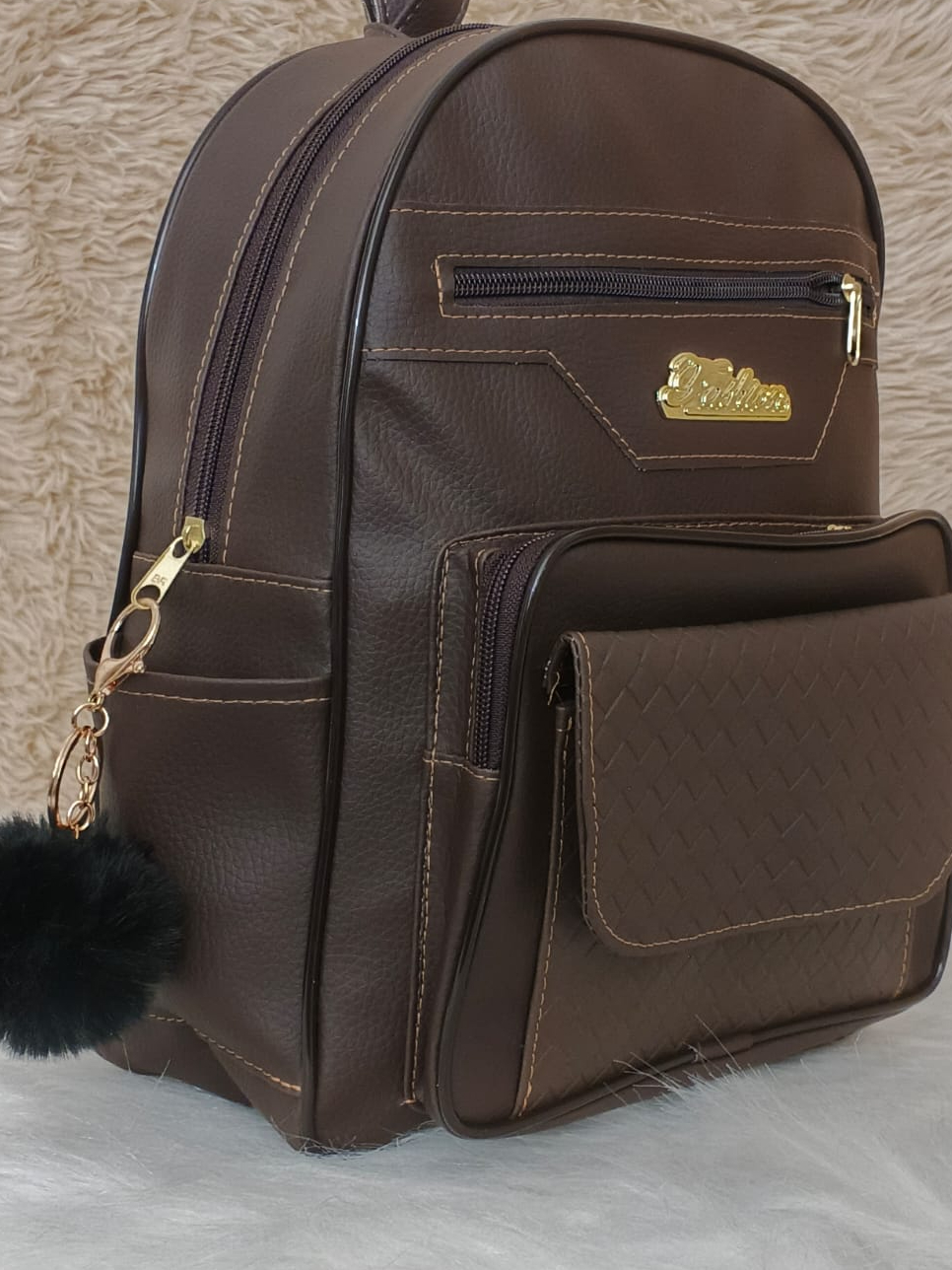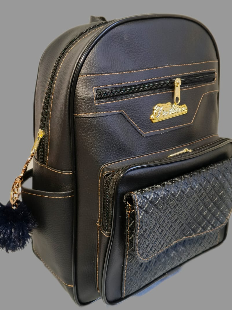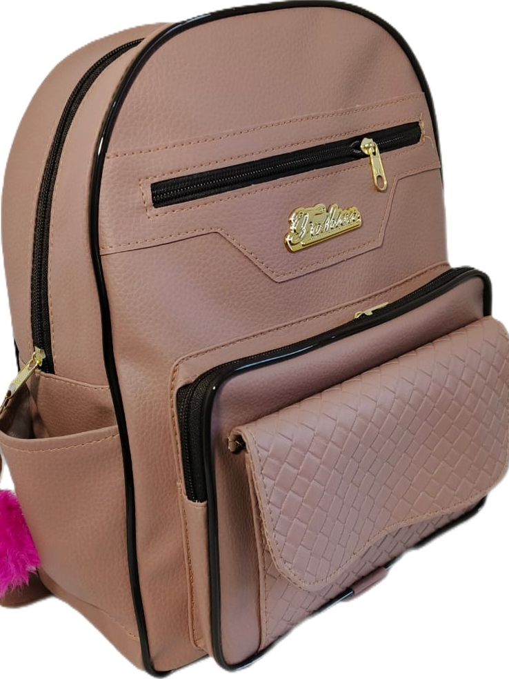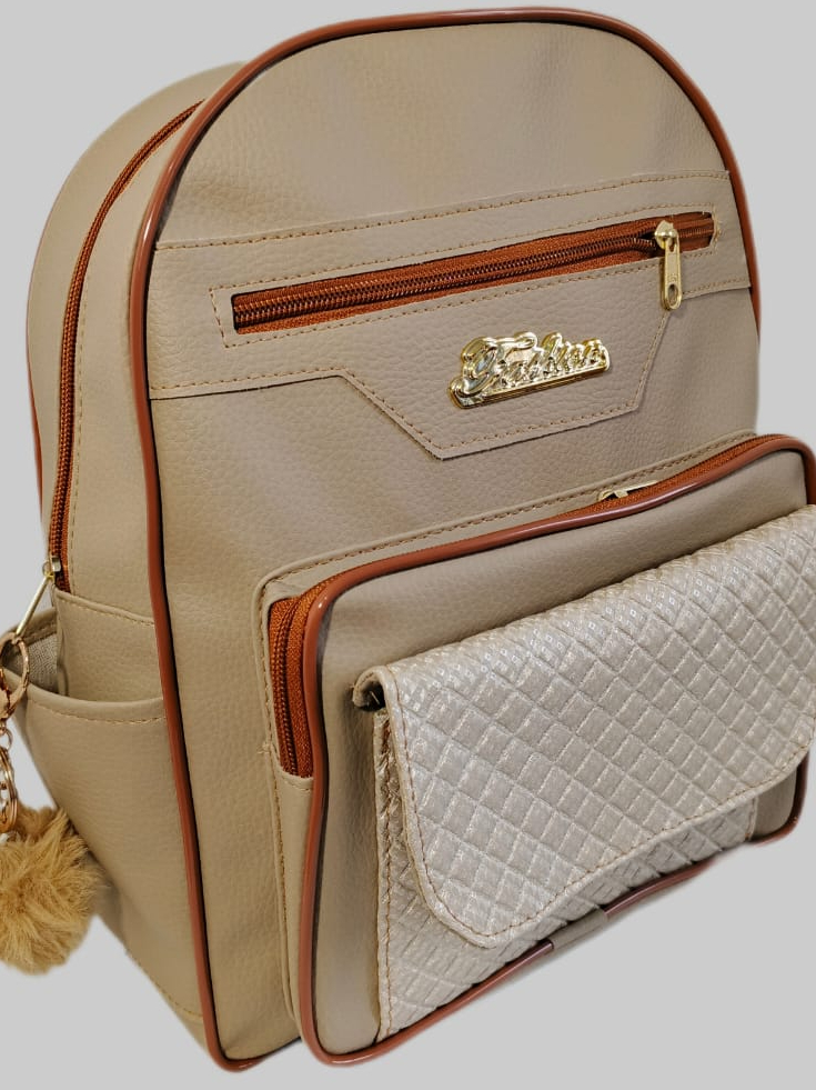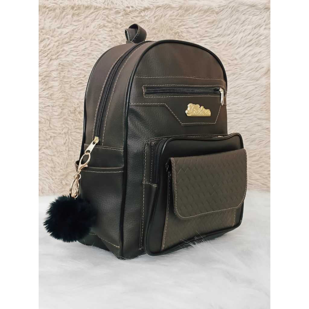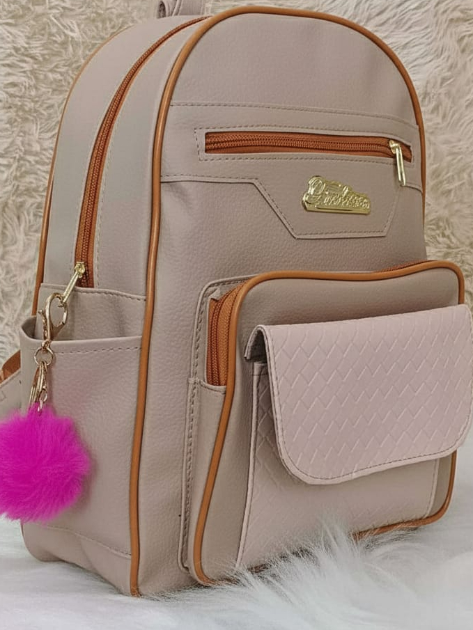 Mochila Feminina de Couro Sintetico Casual deTrês Compartimentos Mas Bolsos Laterais e Frontal + Chaveiro pompom