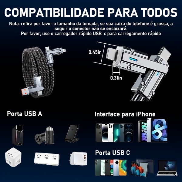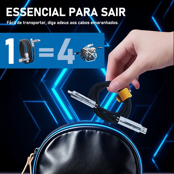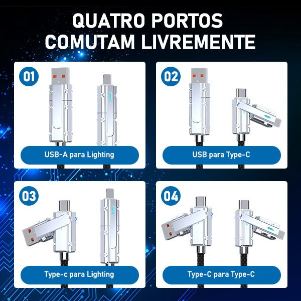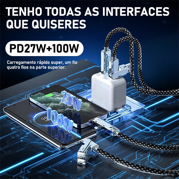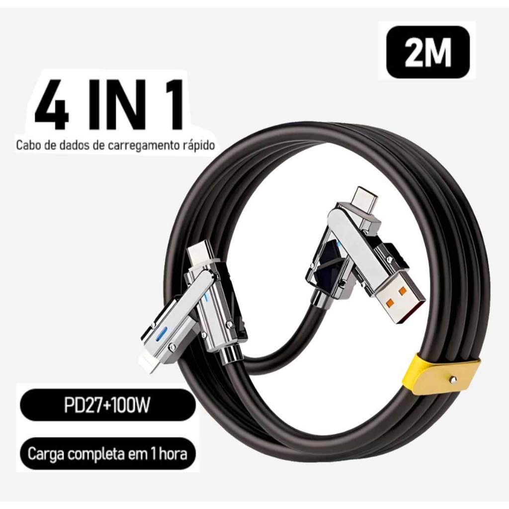 Cabo de carregamento rápido de 2 metros, 4 em 1, 100 W, compatível com Android, Apple, Type-C e Lightning.