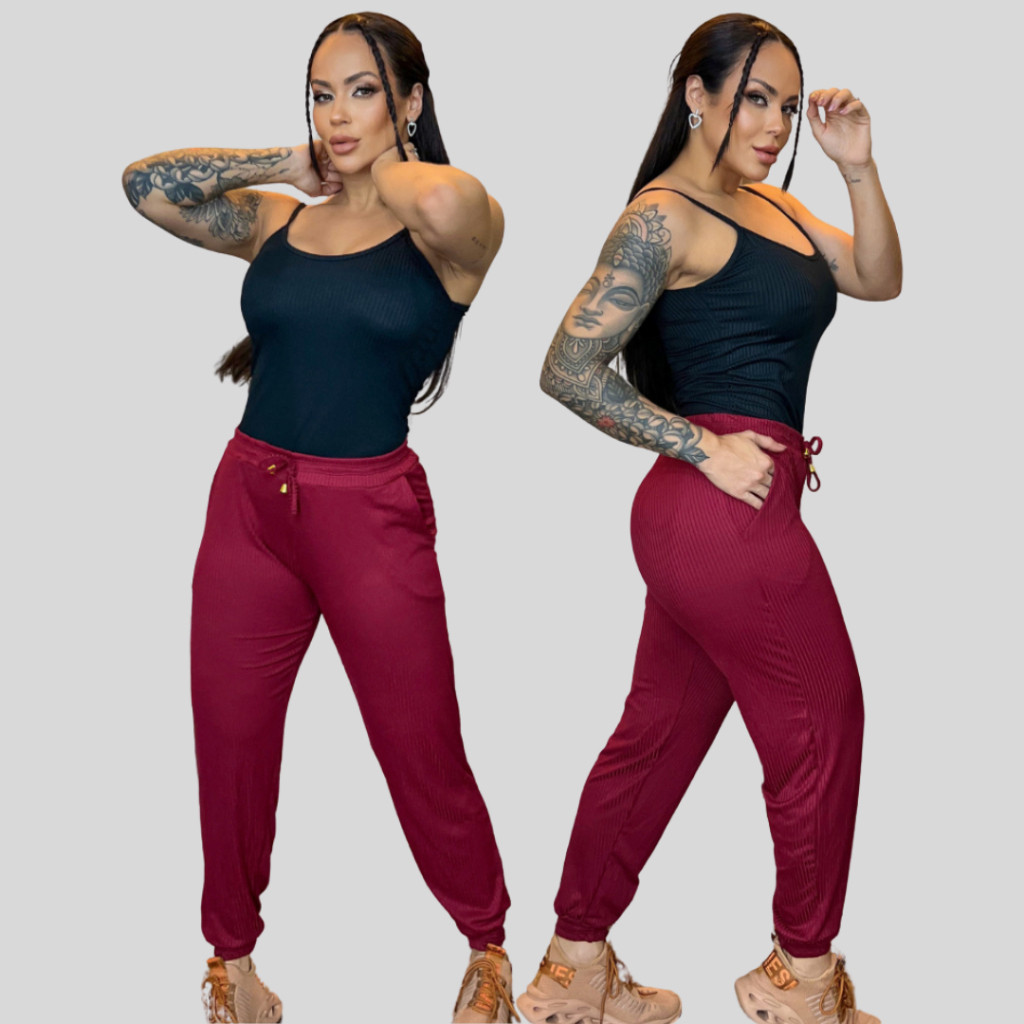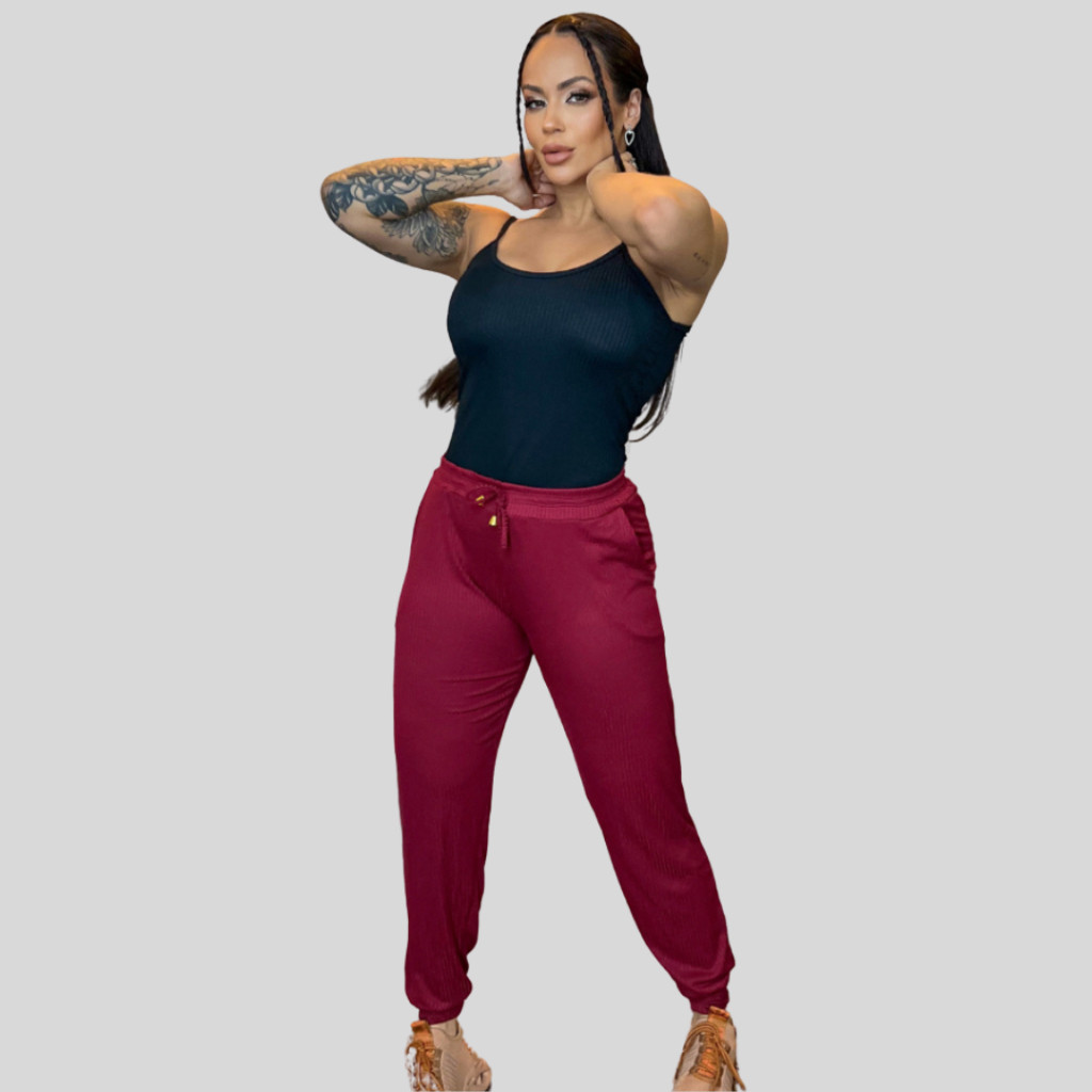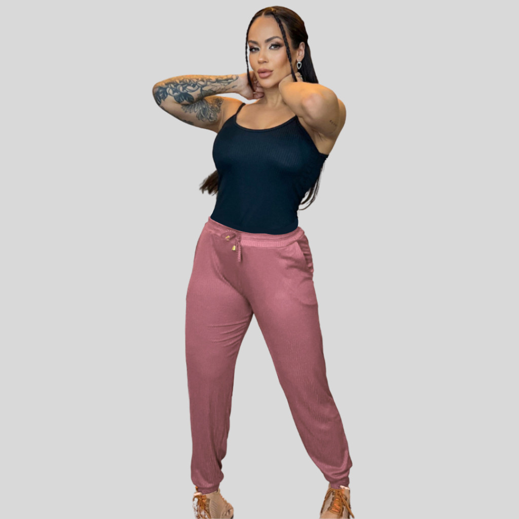 Calça Feminina Jogger Malha Canelada Premium Estilosa Com Bolso Legging Skinny