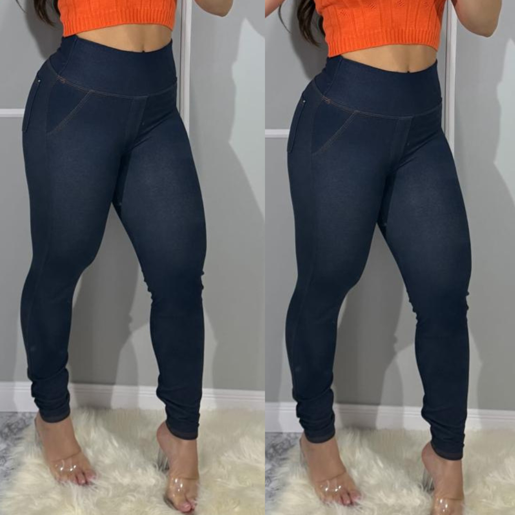 KIT 2 Calças Legging Cotton Imita Jeans Feminina Cintura Alta Modeladora Com Bolso Atrás