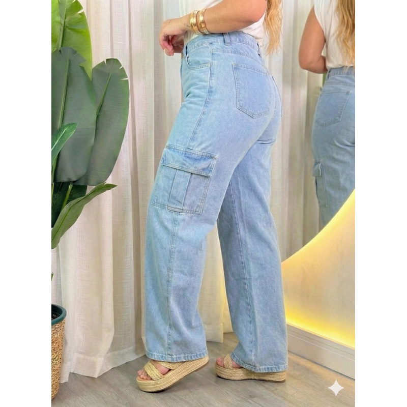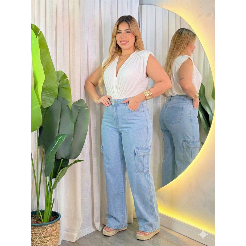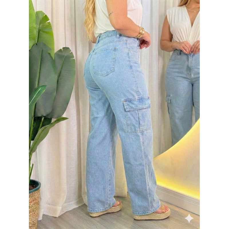 Calça Wide Leg Cargo Cintura Alta pantalona jeans Tendência Moda Feminina Premium