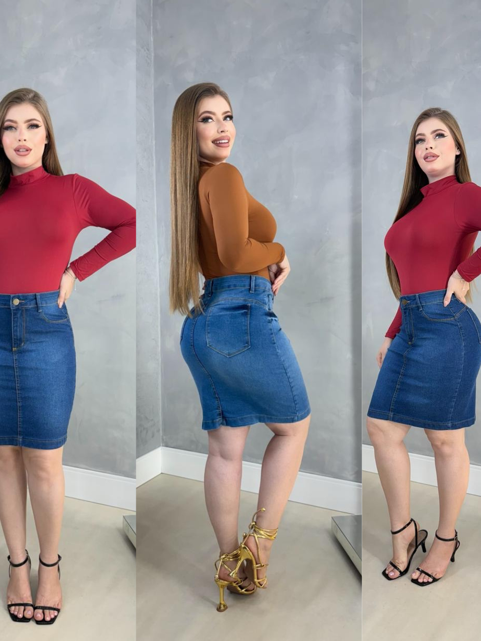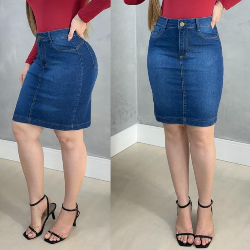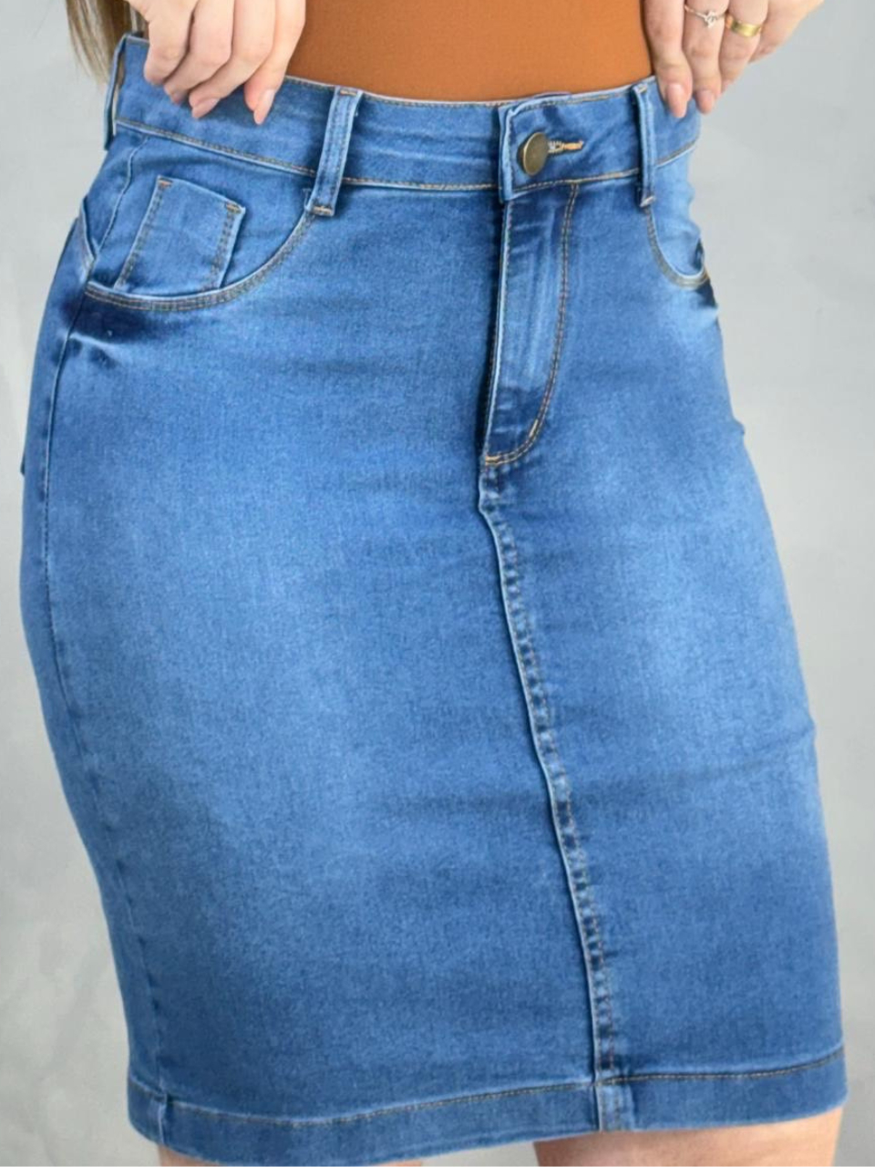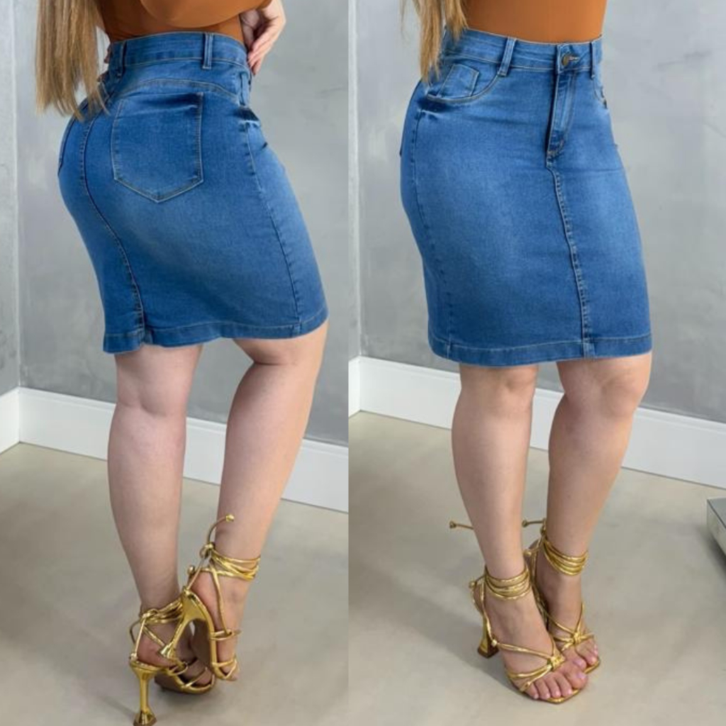 Saia Jeans Feminina Evangélica Secretaria Cintura Alta com Botões Elegante Confortável e Versátil