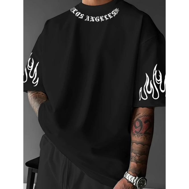 Camiseta Oversized Unissex Estilo Rap Chamas nas Mangas Los Angeles Street dia a dia 100% Algodão