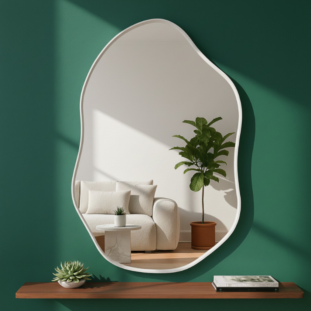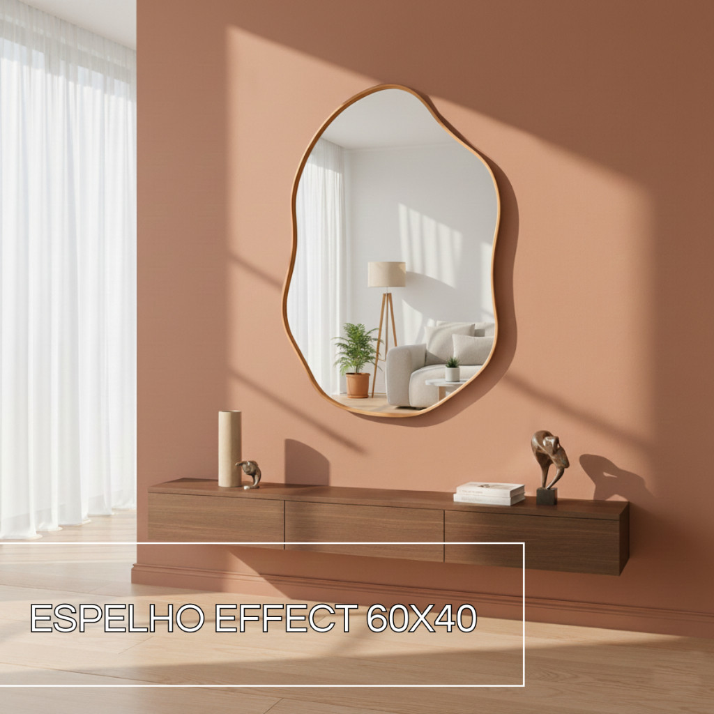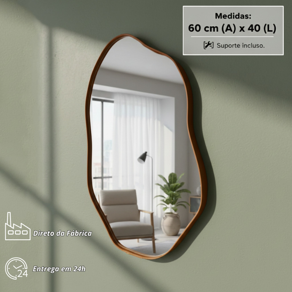 Espelho Orgânico 60x40 Couro Caramelo + Suporte Metálico decoração Sala Penteadeira Quarto Banheiro