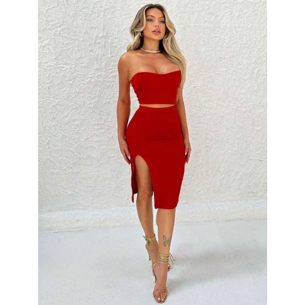Conjunto Feminino Elegante Cropped Tomara Que Caia Nuvem + Saia Midi Com Fenda