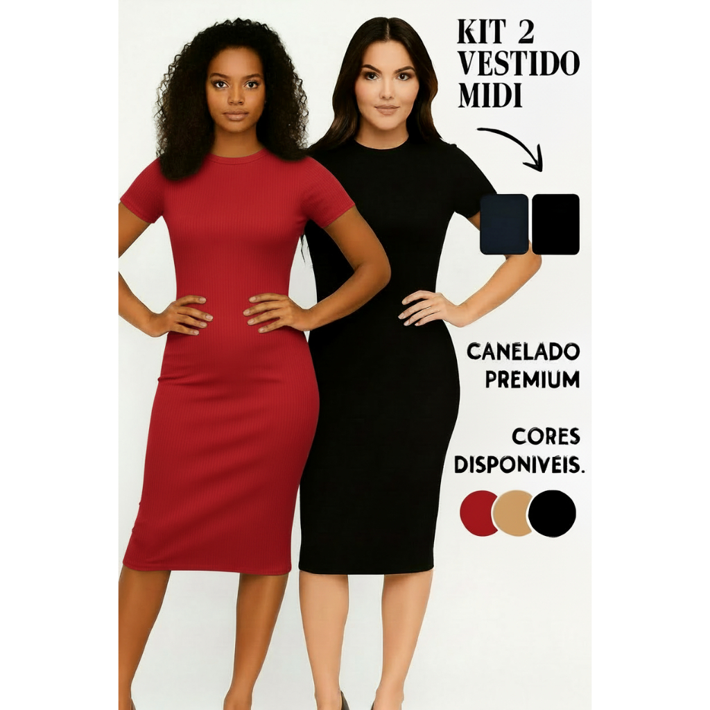 Kit 2 Vestido Longo Canelado com Fenda e Manga Decote Quadrado Sem Bojo