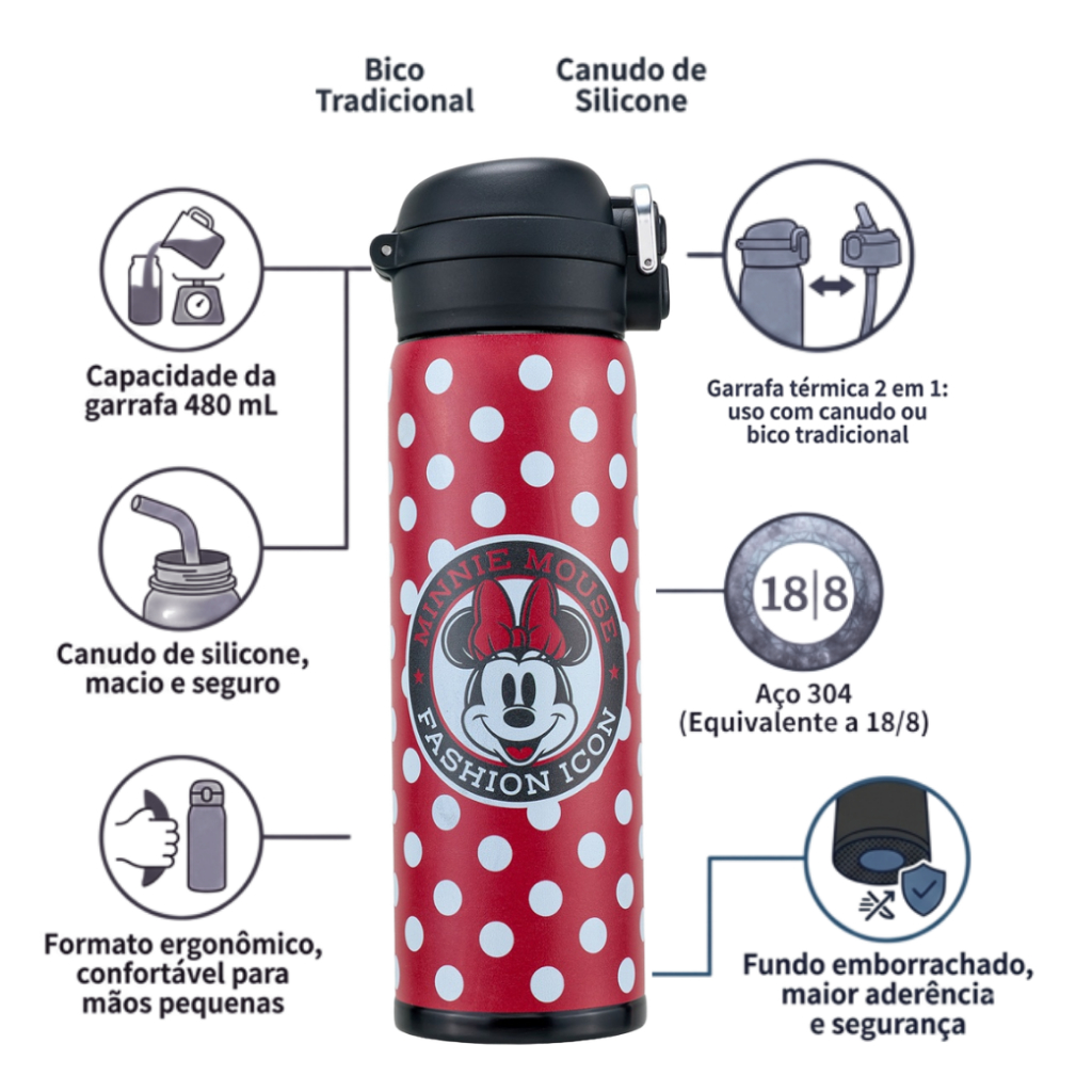 Garrafa Água Térmica Squeeze Minnie Mouse 480ml Resistente Escola Passeio Disney