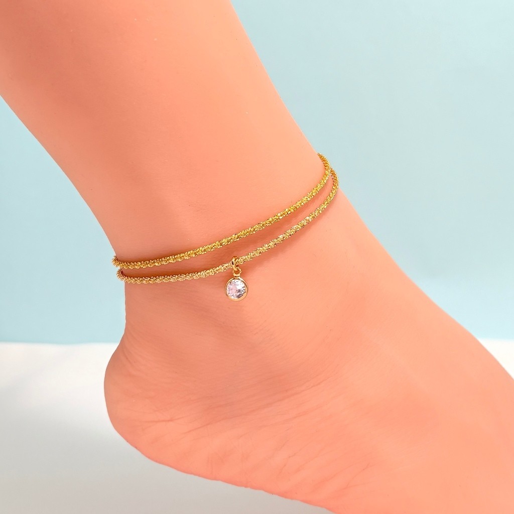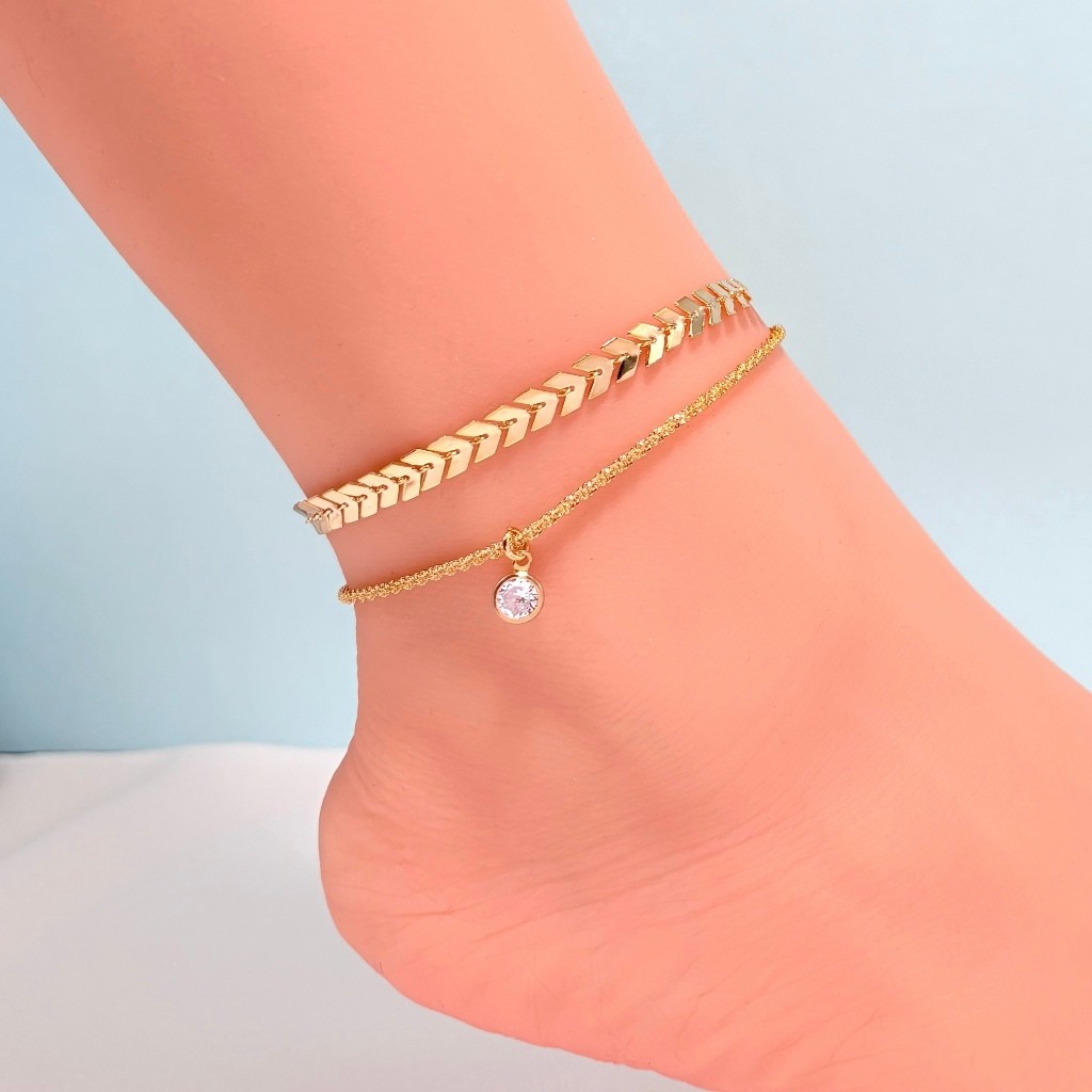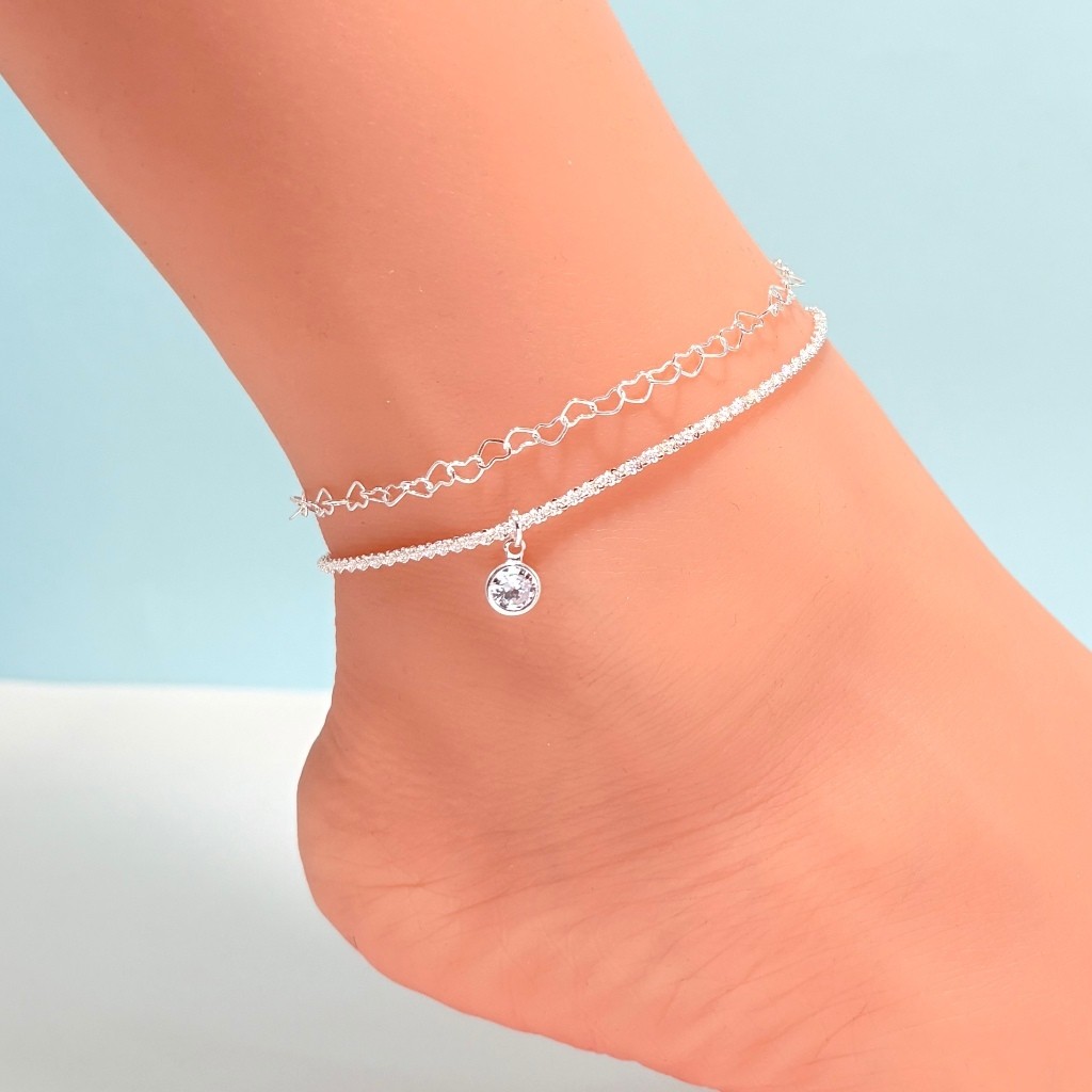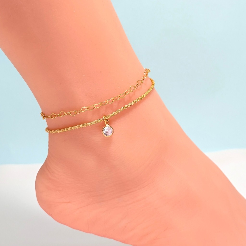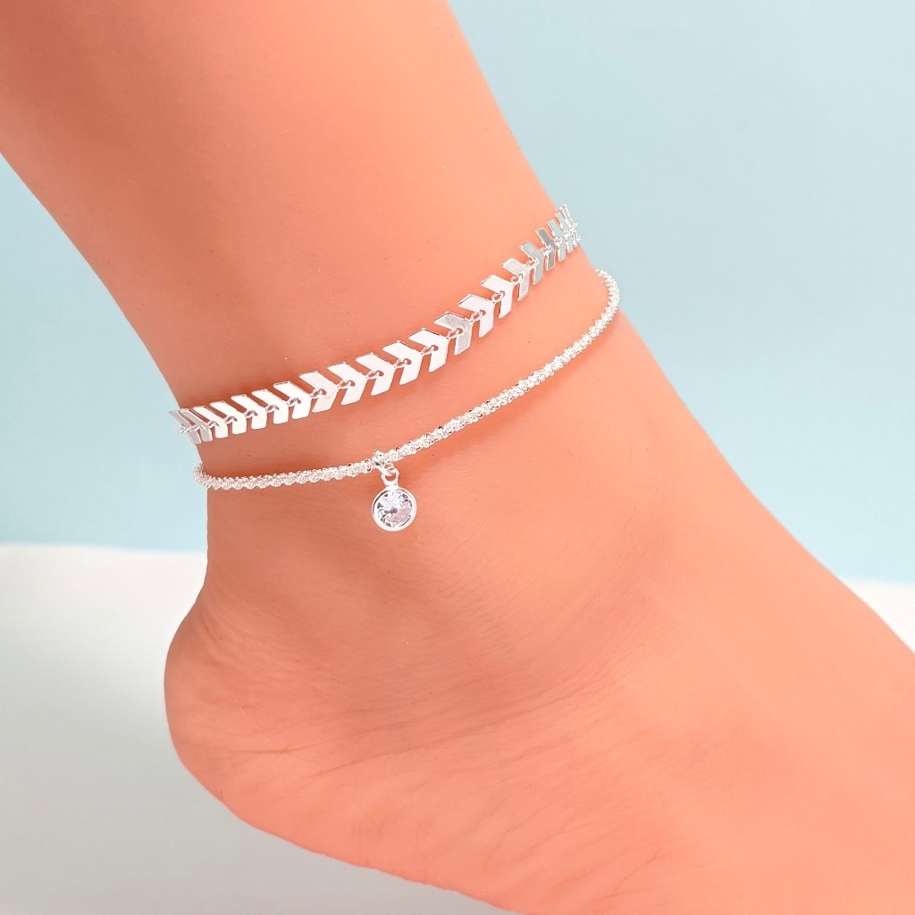 2 peças de tornozeleiras femininas da moda, tornozeleira de gipsófila + pingente redondo de zircônia