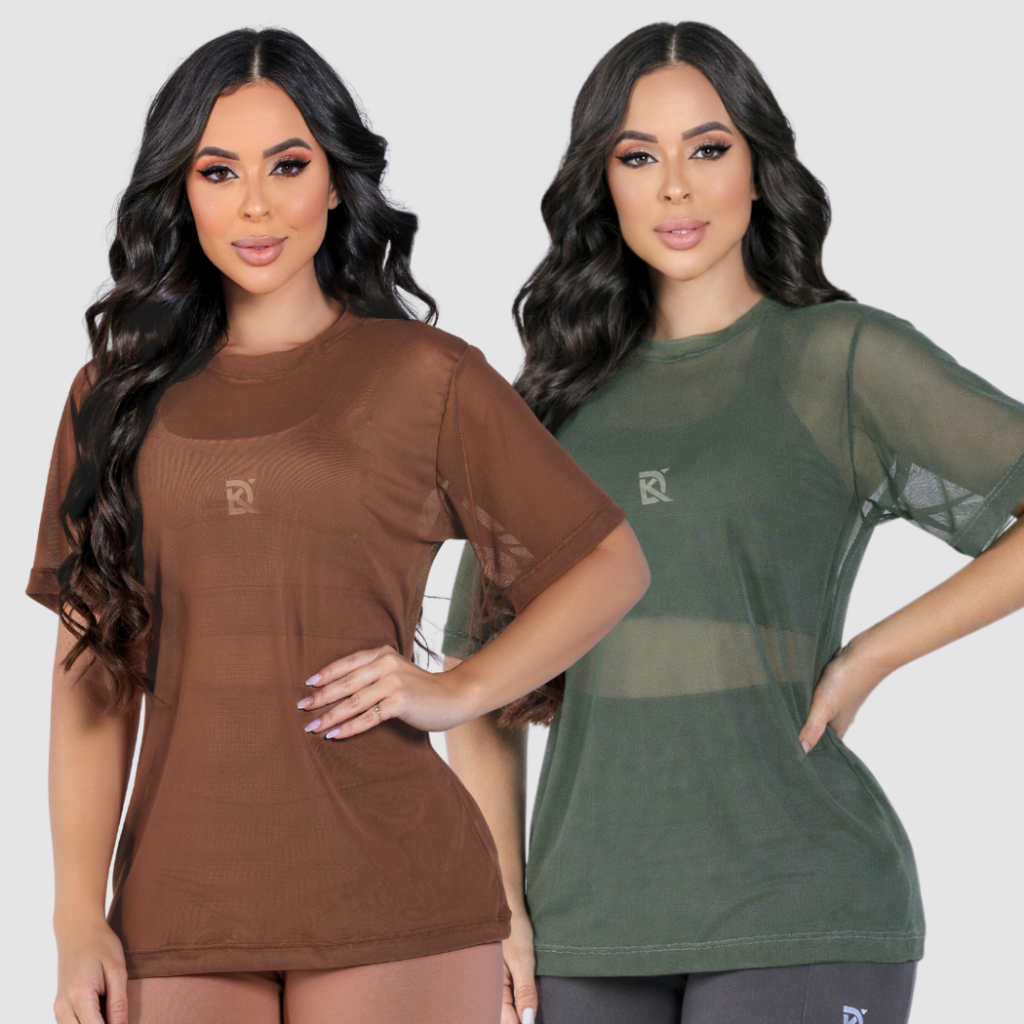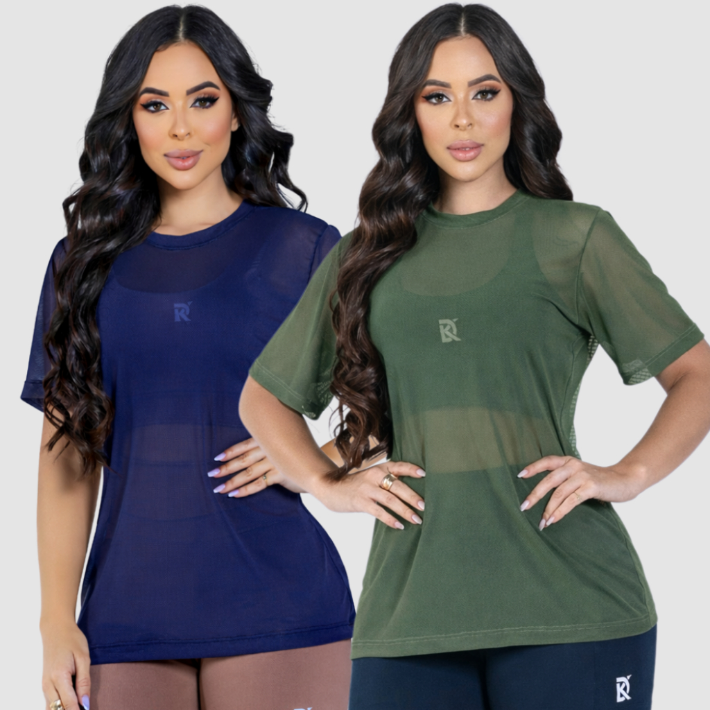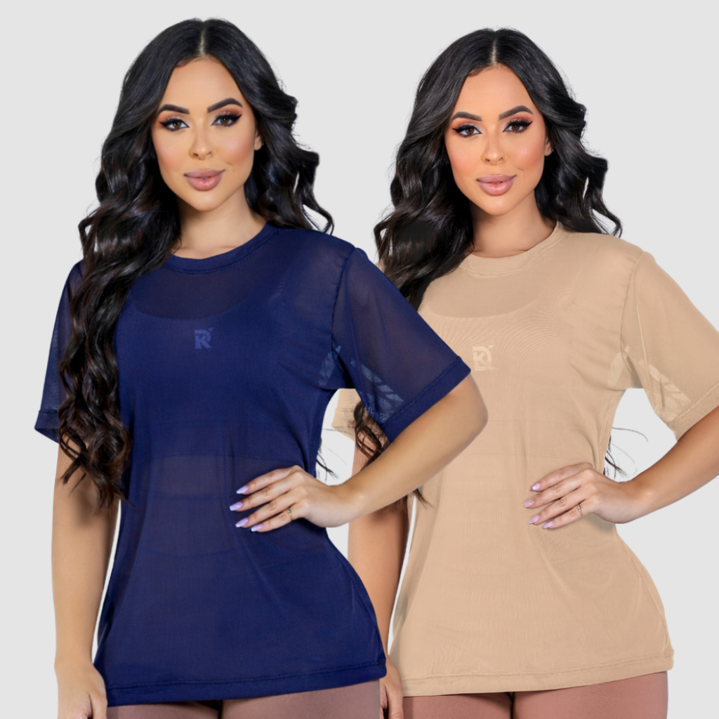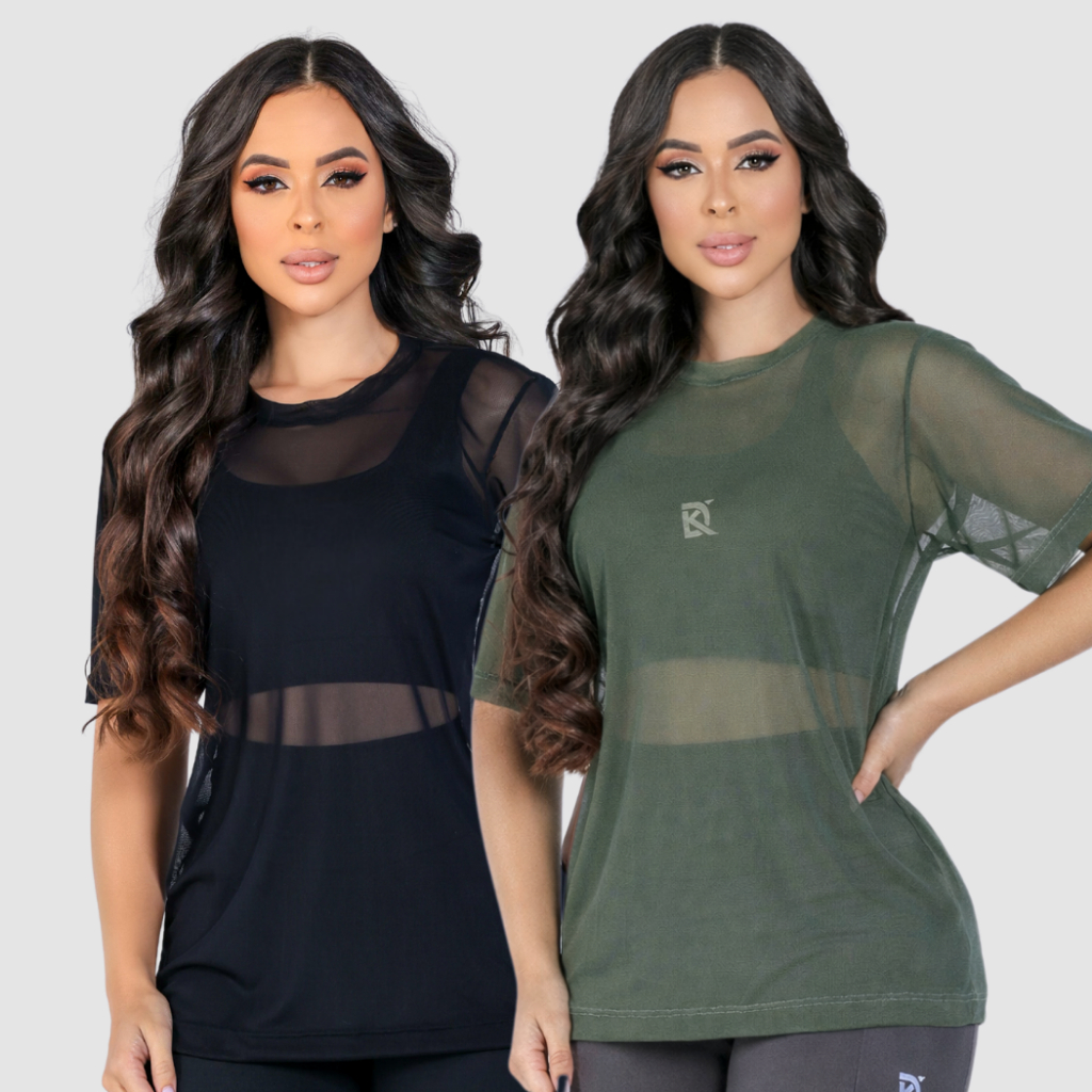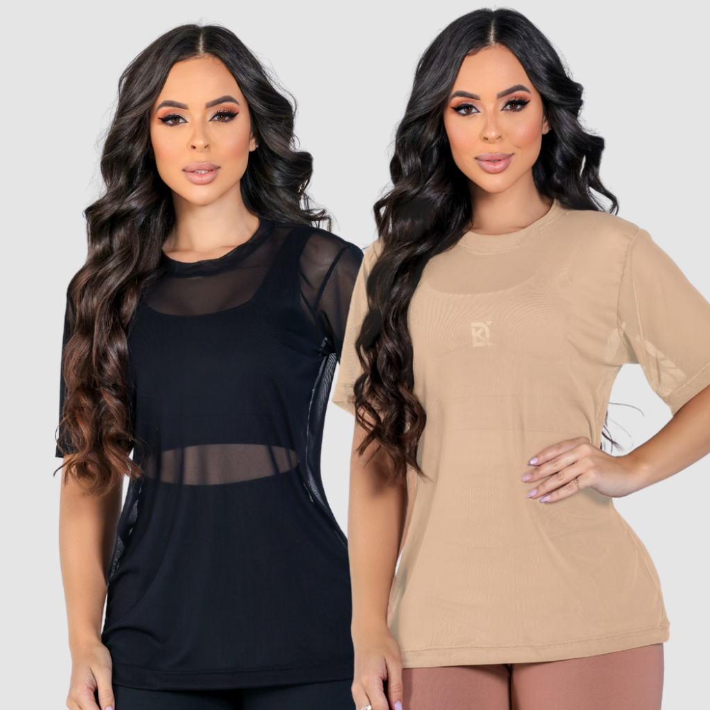 Kit 2 Blusa Feminina Transparente de Tule Manga Curta Camiseta Academia Treino