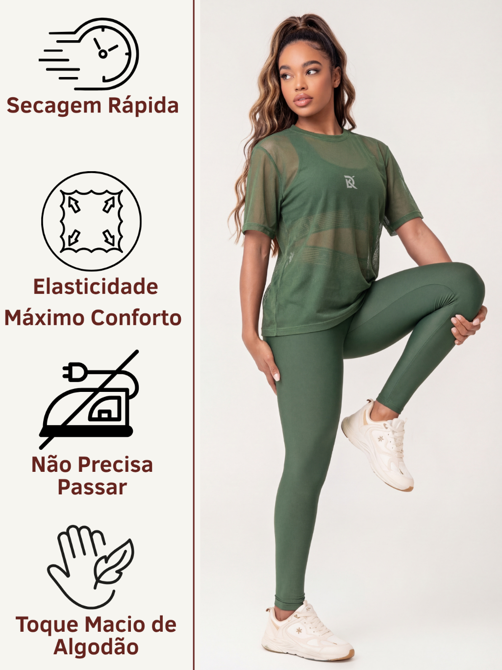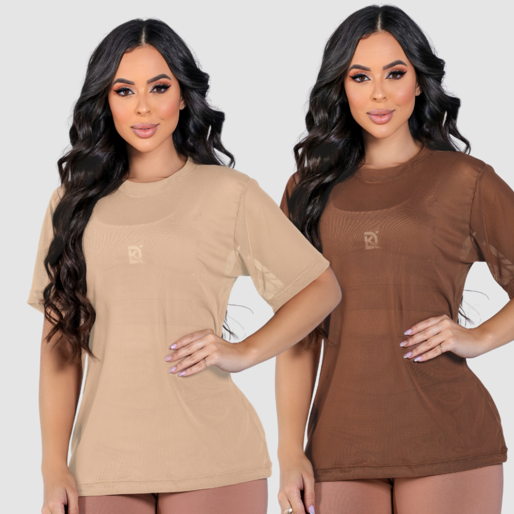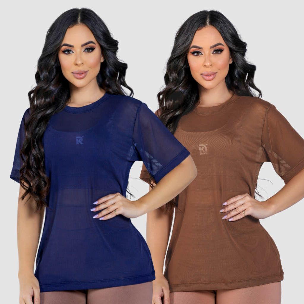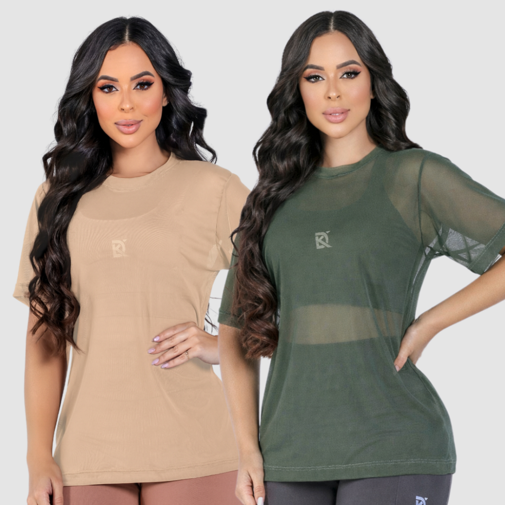 Kit 2 Blusa Feminina Transparente de Tule Manga Curta Camiseta Academia Treino