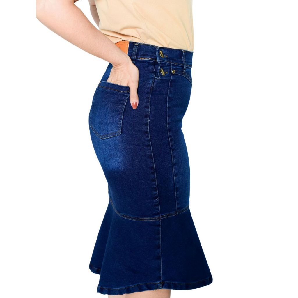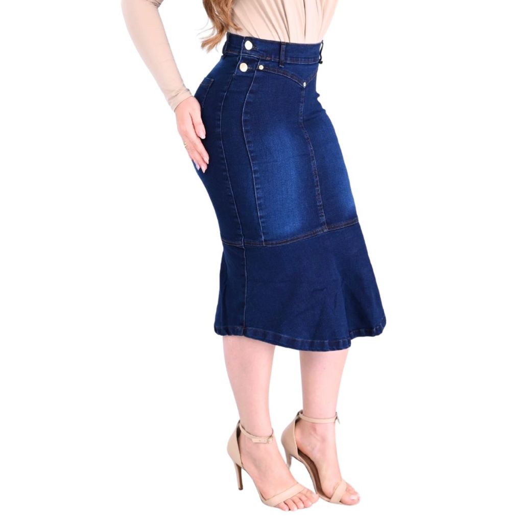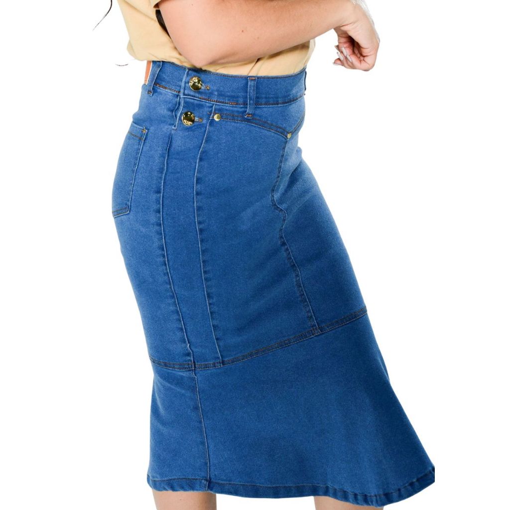 Saia Jeans Brunna Midi Com Botoes Laterais Com Lycra Confortavel