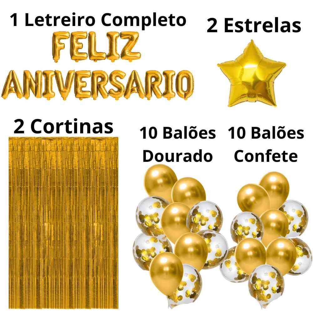 Kit Dourado Feliz Aniversário + Balões Decorativos + 2 Cortinas para Festa Perfeita