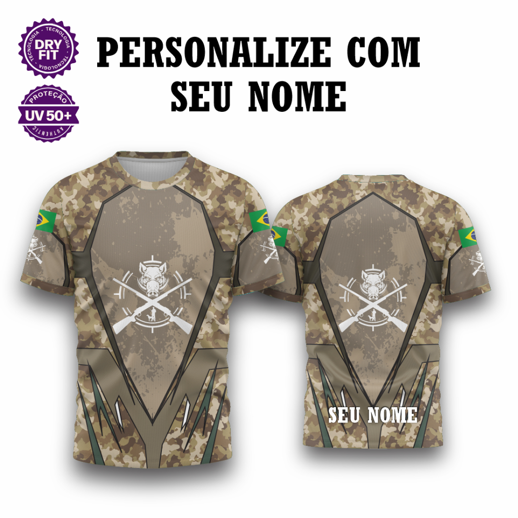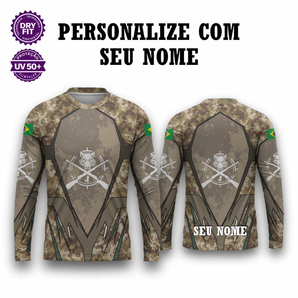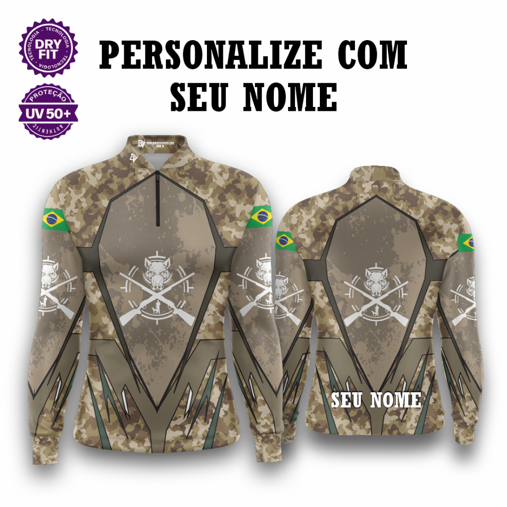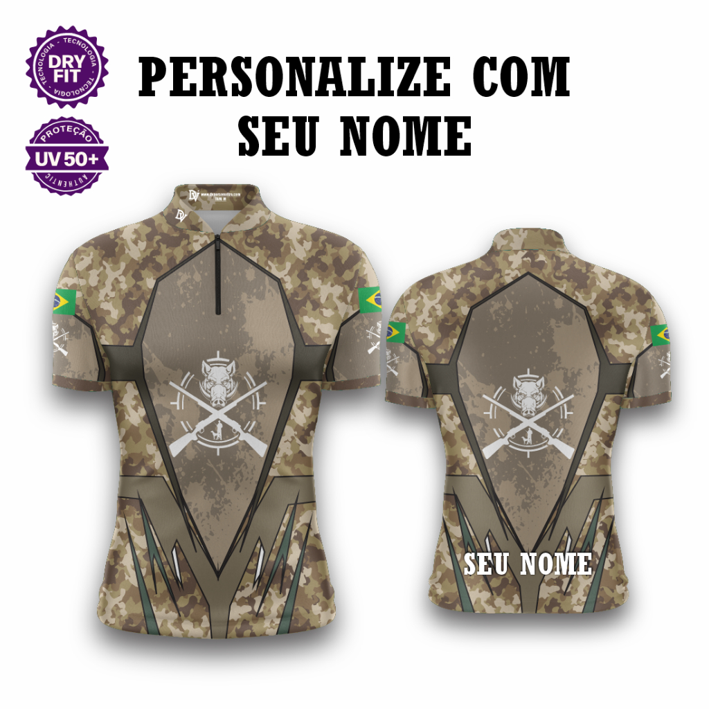 Camisa Zíper Caça Camuflado Javali – Unissex UV50+ Premium Personalizada