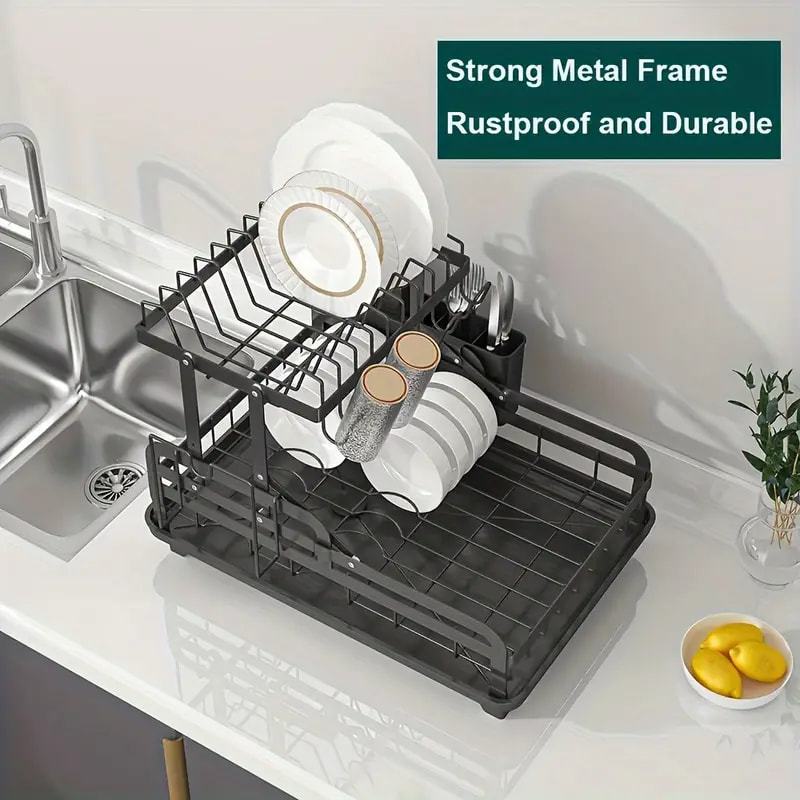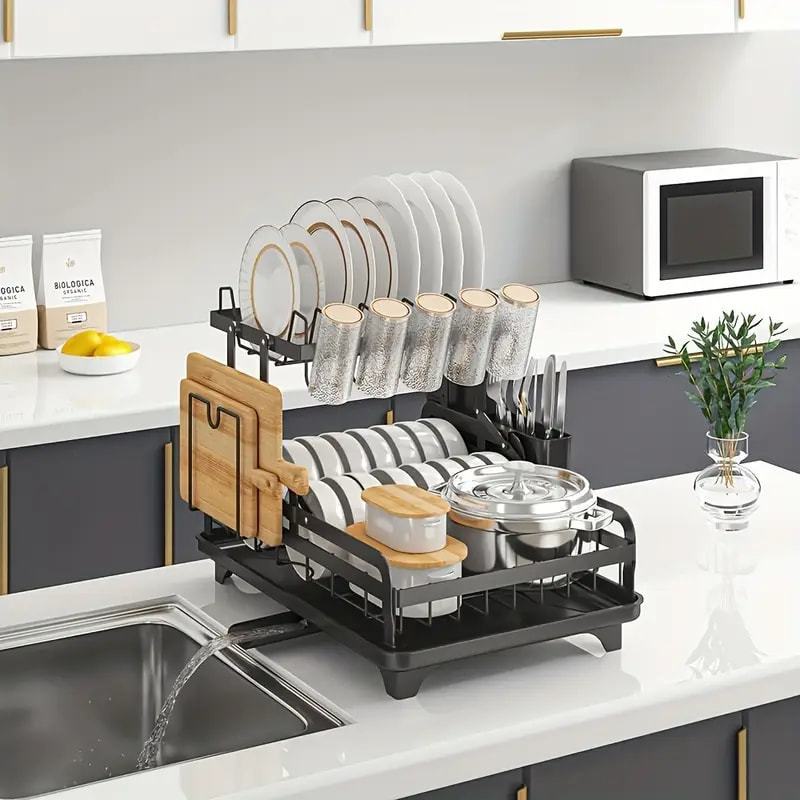 Escorredor de Louça 2 Andares com Dreno 360° Giratório – Aço Carbono Antiferrugem e Grande Capacidade