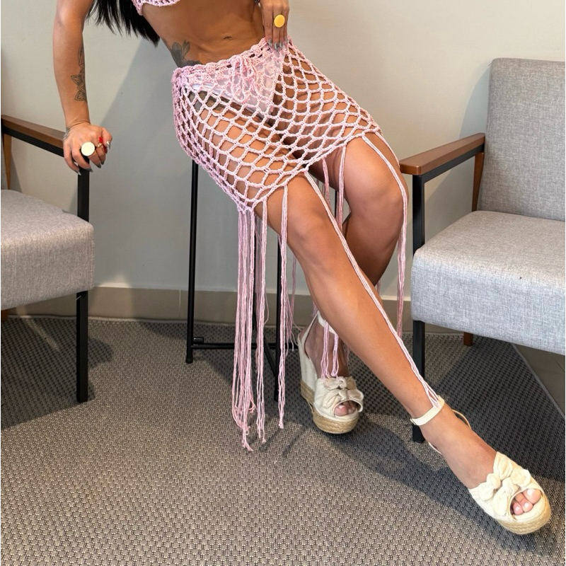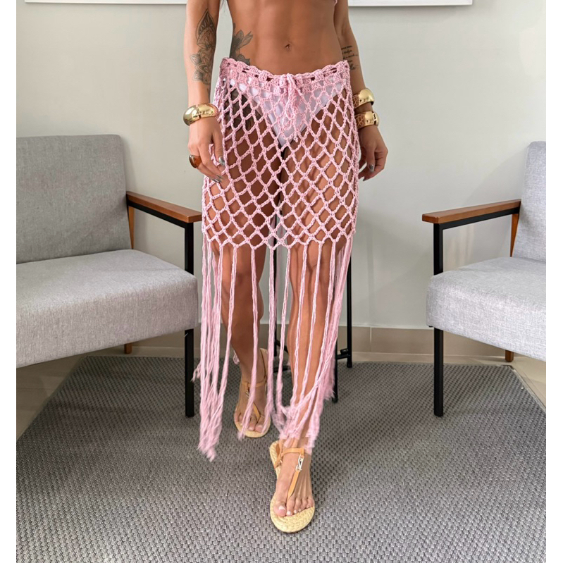 Saia de Crochê feminina com franja Saída de praia/ resort moda praia artesanal