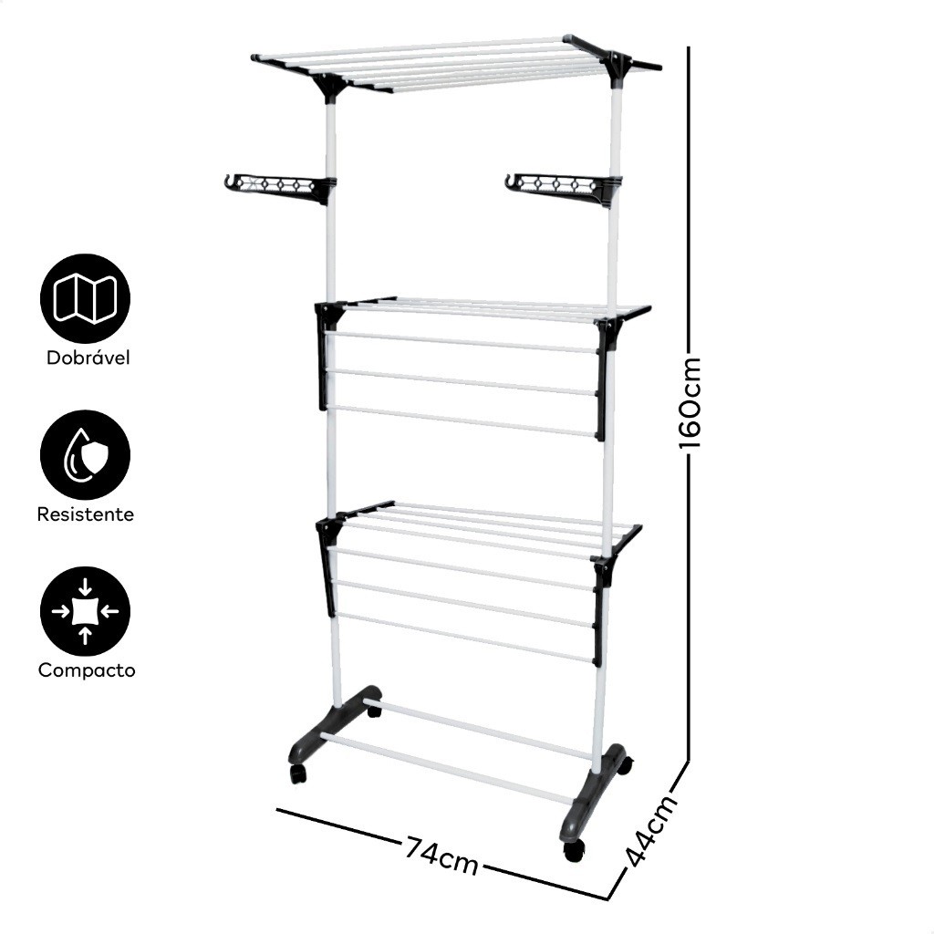 Rack de secagem retrátil, compacto e dobrável de três camadas, com rodas