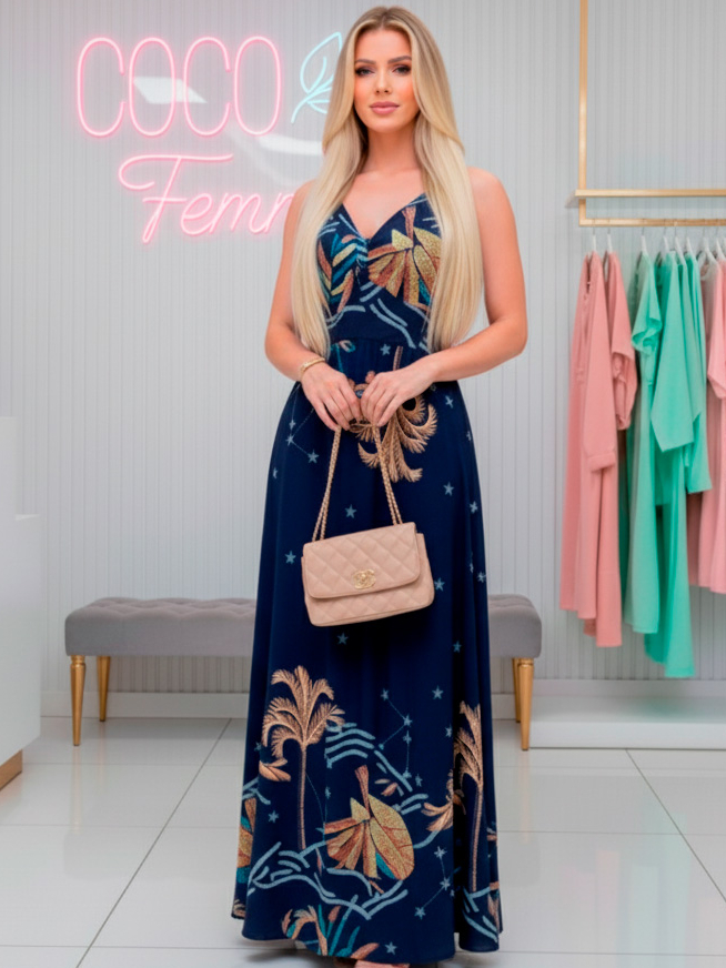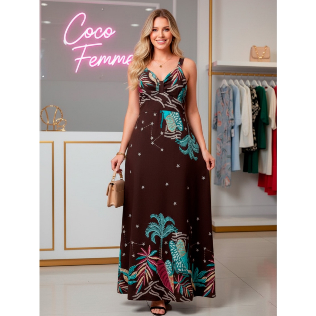 Vestido Longo Feminino Estampado Duna Premium Lastex Costas Busto Torcido P ao GG Festa Praia Viagem Elegante