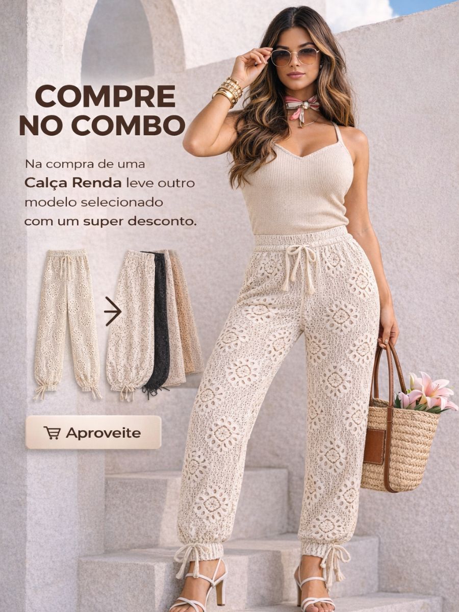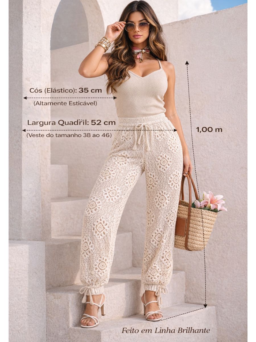 Calça de Tricot Vazado Aladim com Forro Cintura Alta Renda Moda Feminina