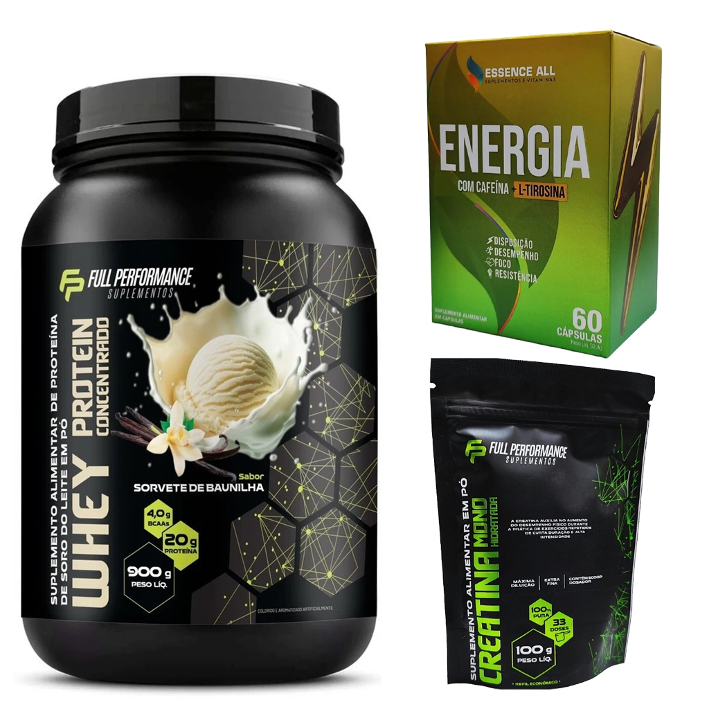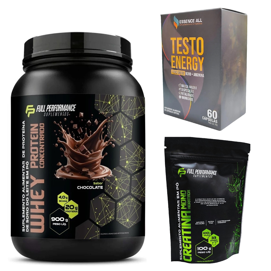 Kit 3 Itens Whey Protein 900g + Creatina 100g + Testo Energy ou Vitamina Energia Full Performance