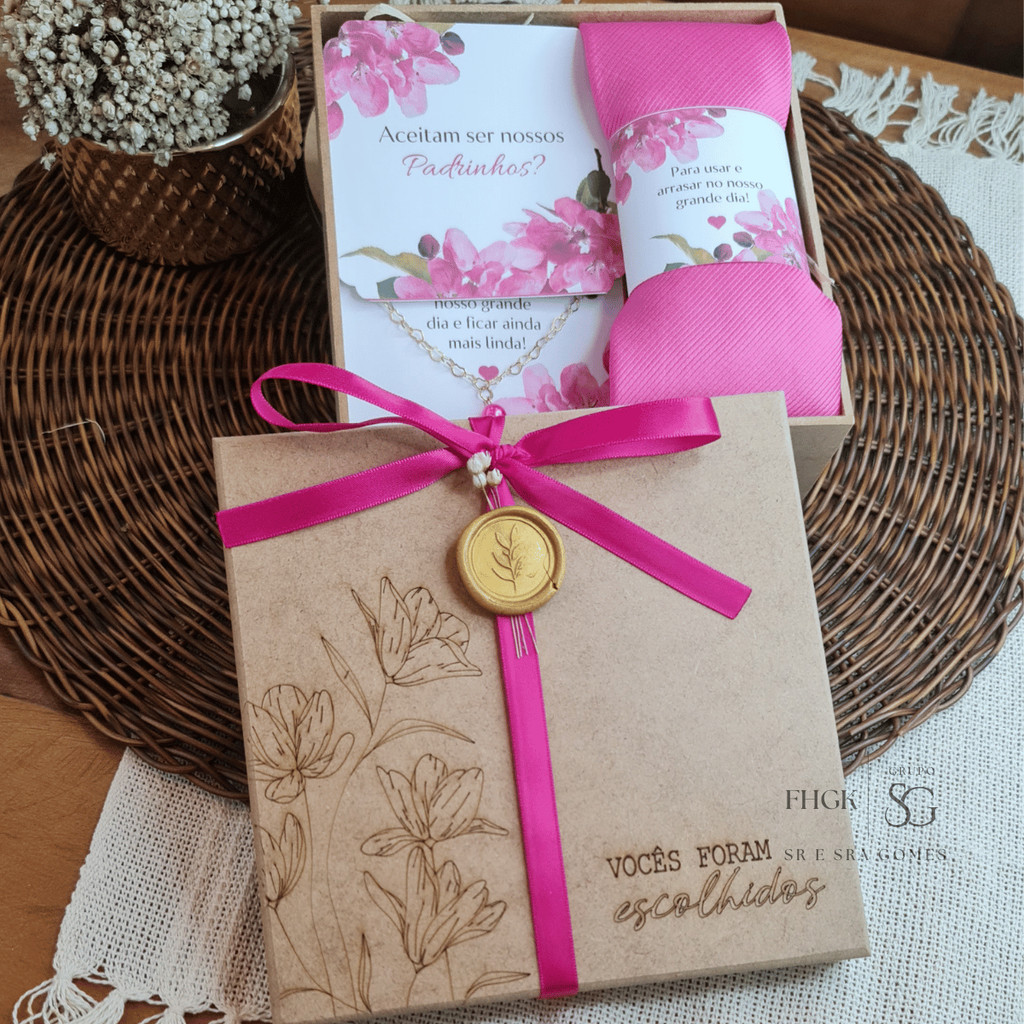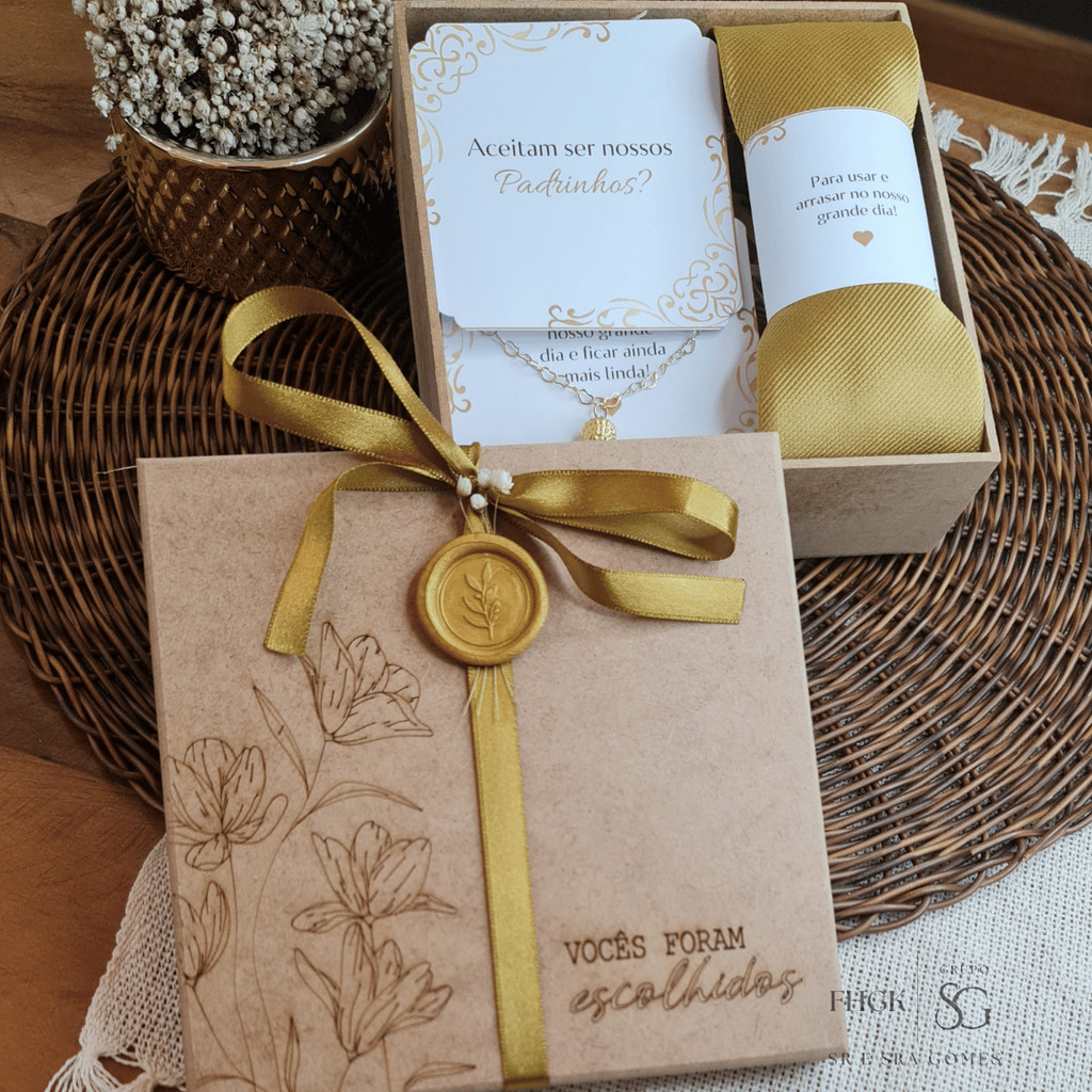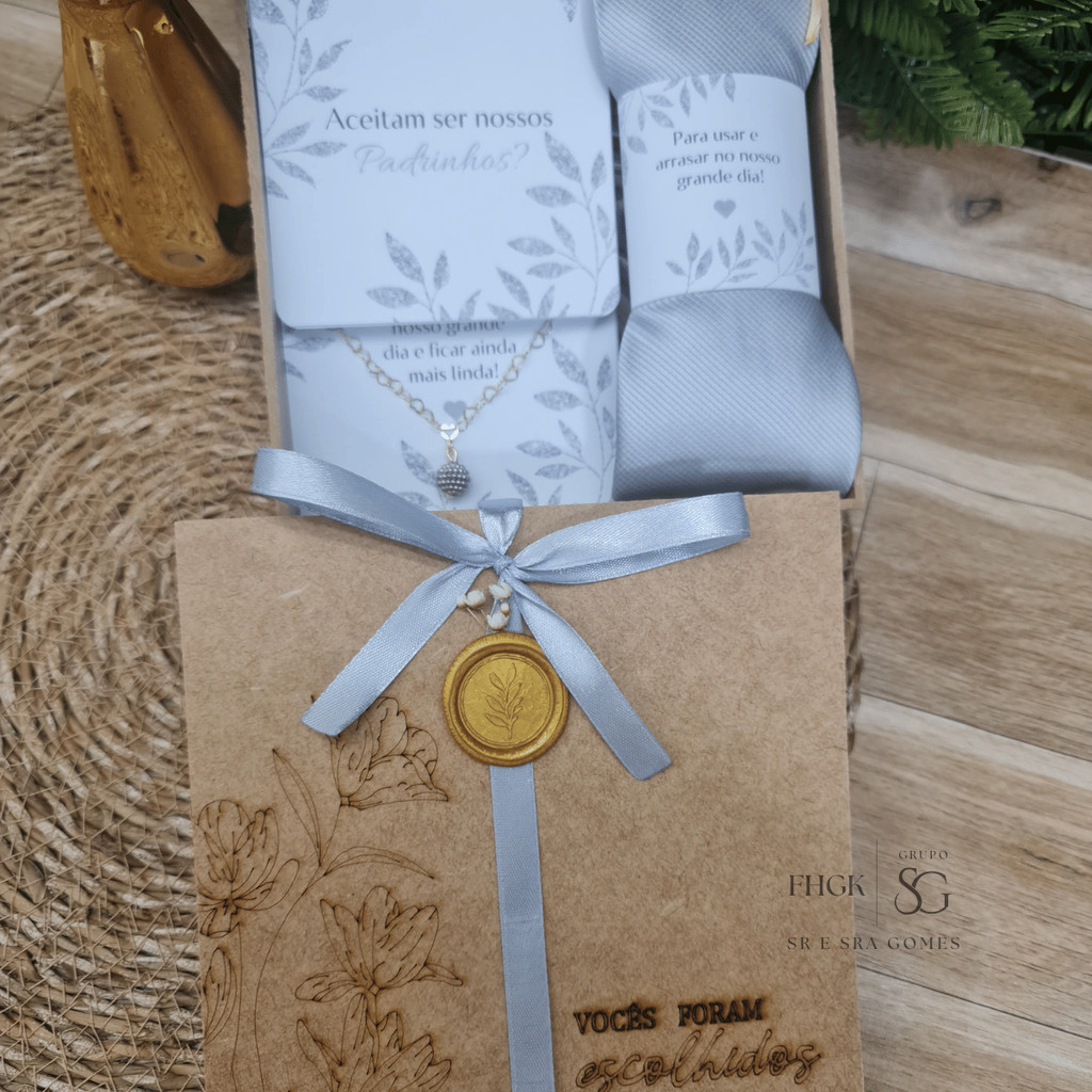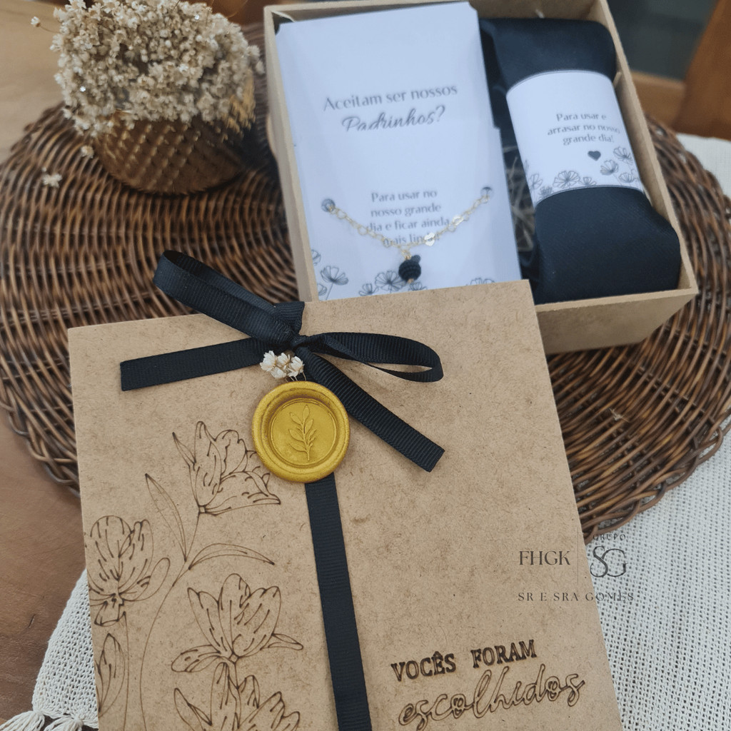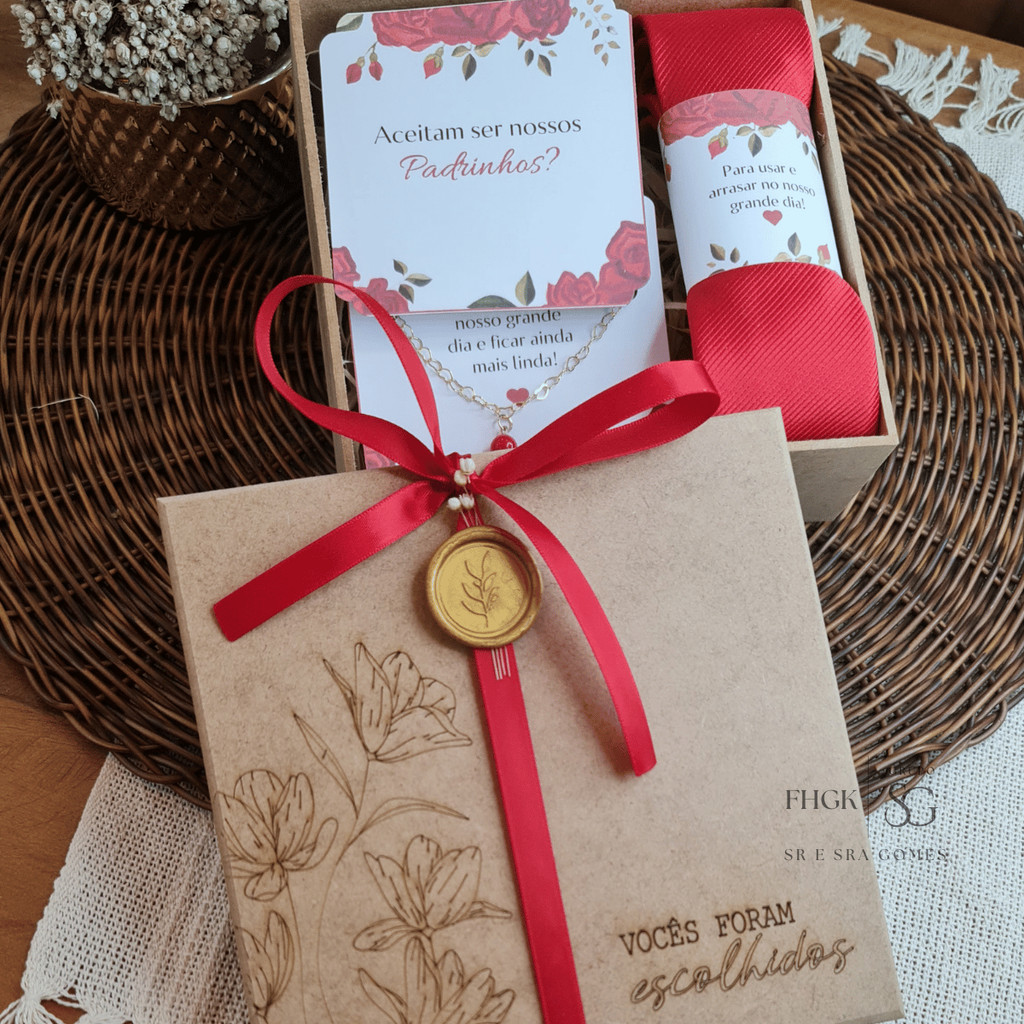 Caixa Convite Casal Para Padrinhos Decorada com Lacre de Cera e Gravata e Pulseira e Tags