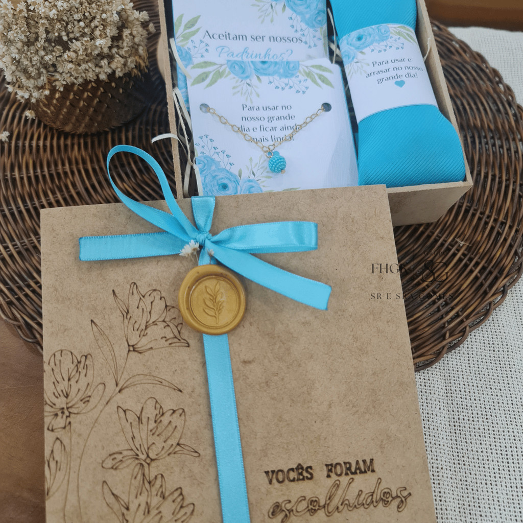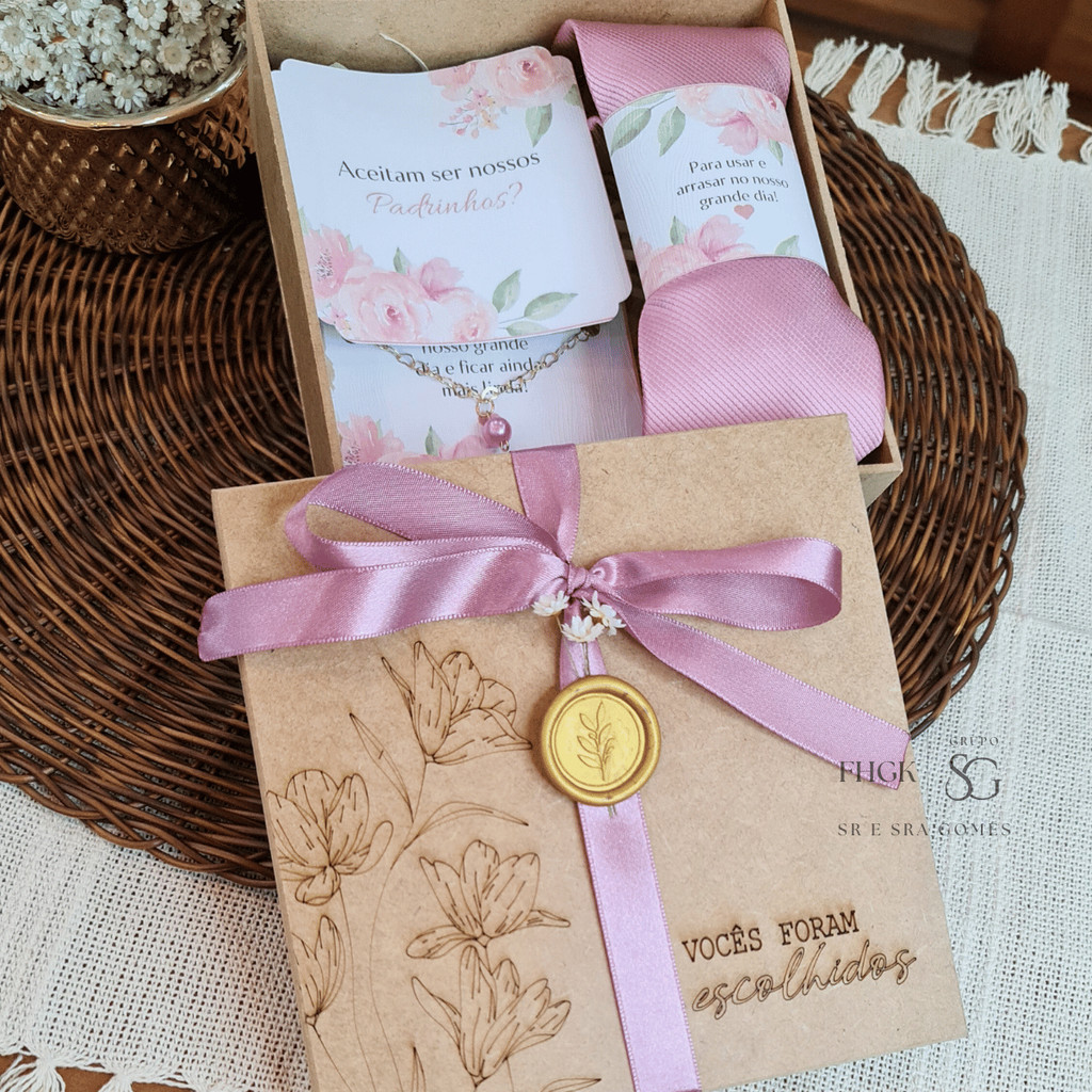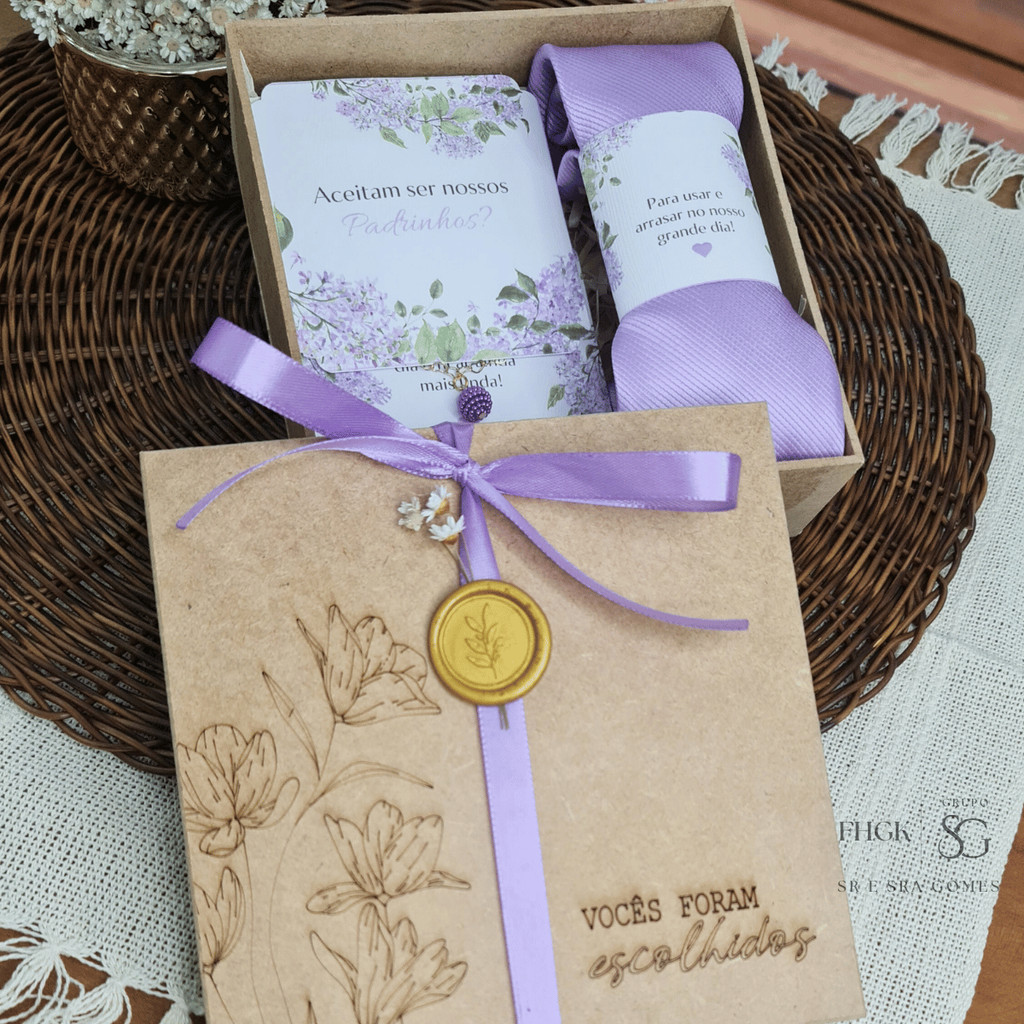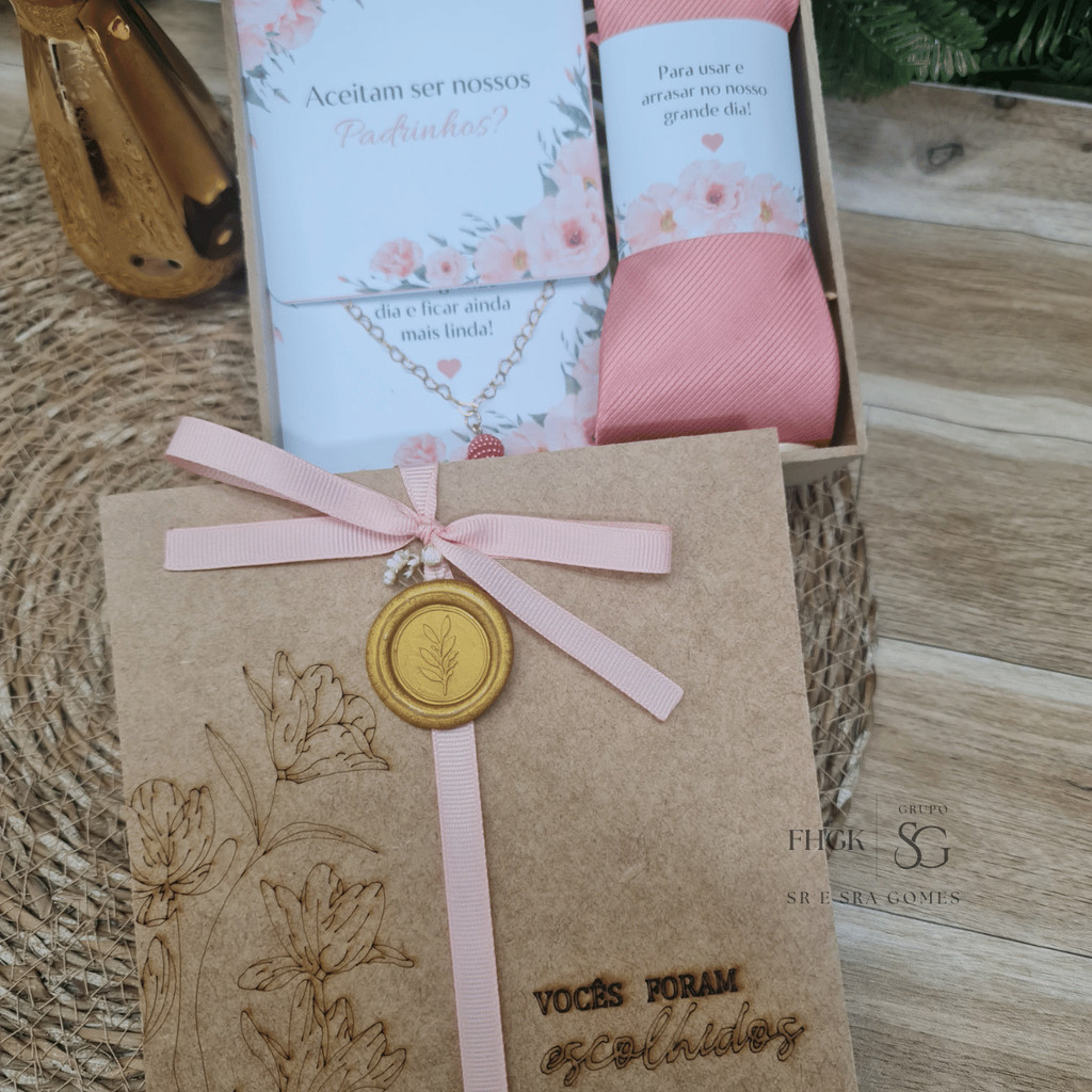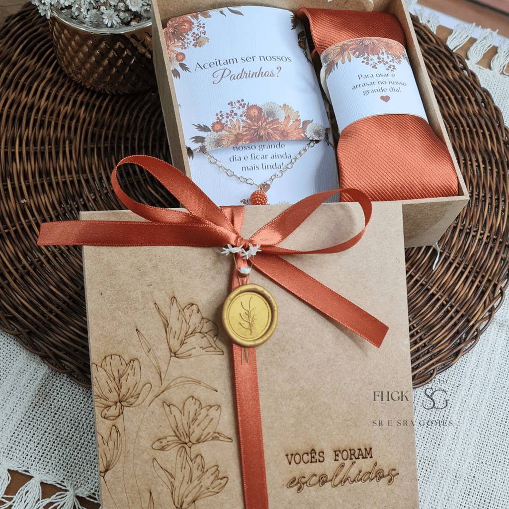 Caixa Convite Casal Para Padrinhos Decorada com Lacre de Cera e Gravata e Pulseira e Tags