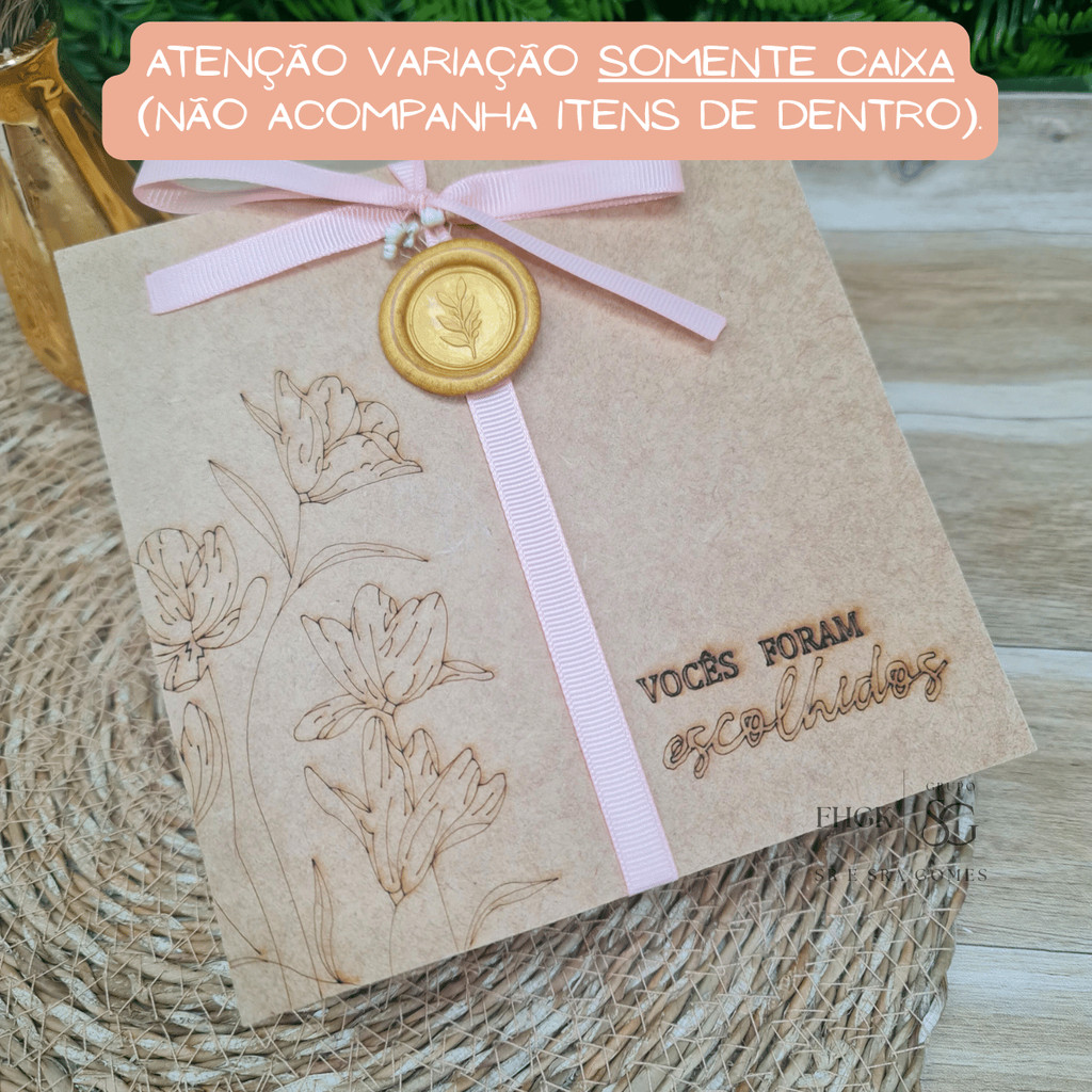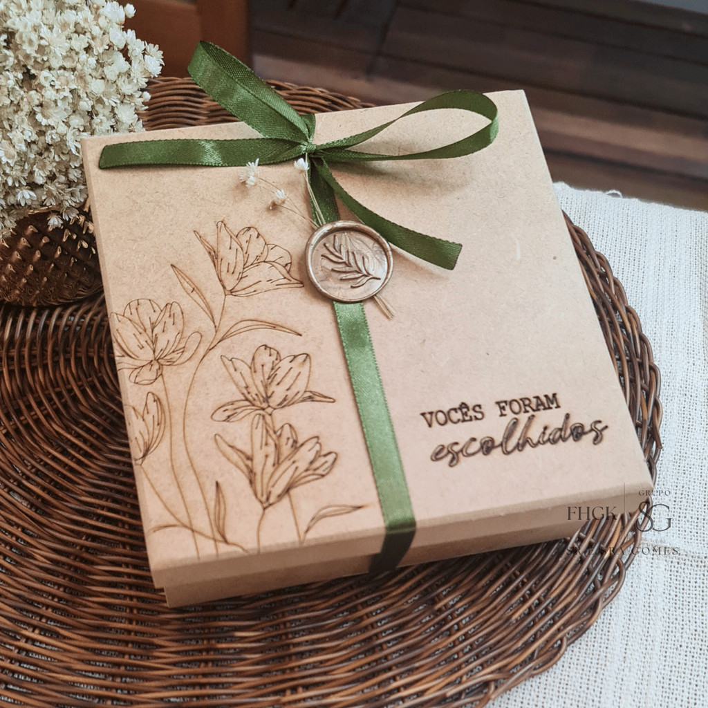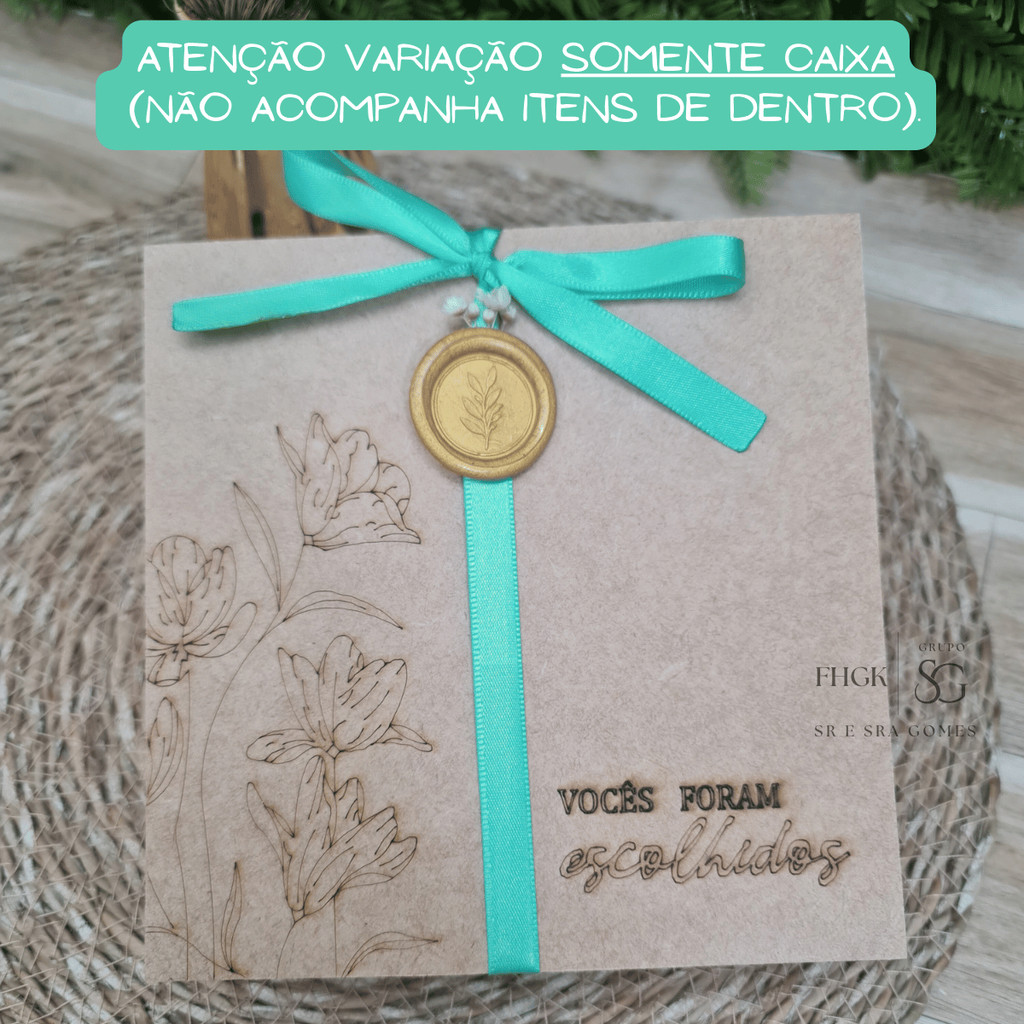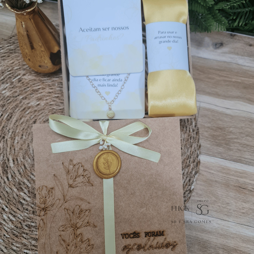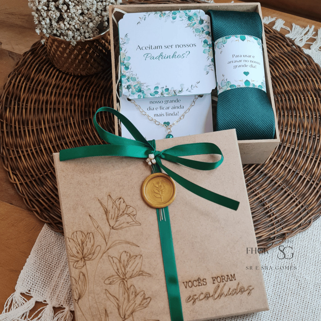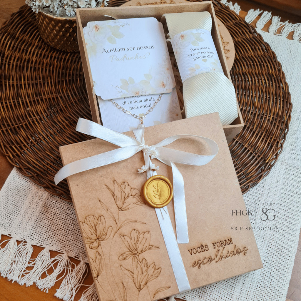 Caixa Convite Casal Para Padrinhos Decorada com Lacre de Cera e Gravata e Pulseira e Tags