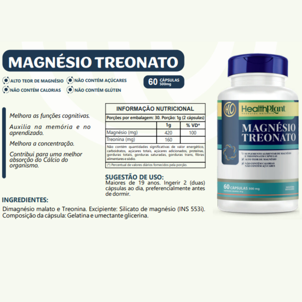 Treonato de Magnésio 60 Cápsulas 500mg ( Magnésio L-Treonato )