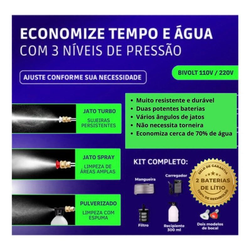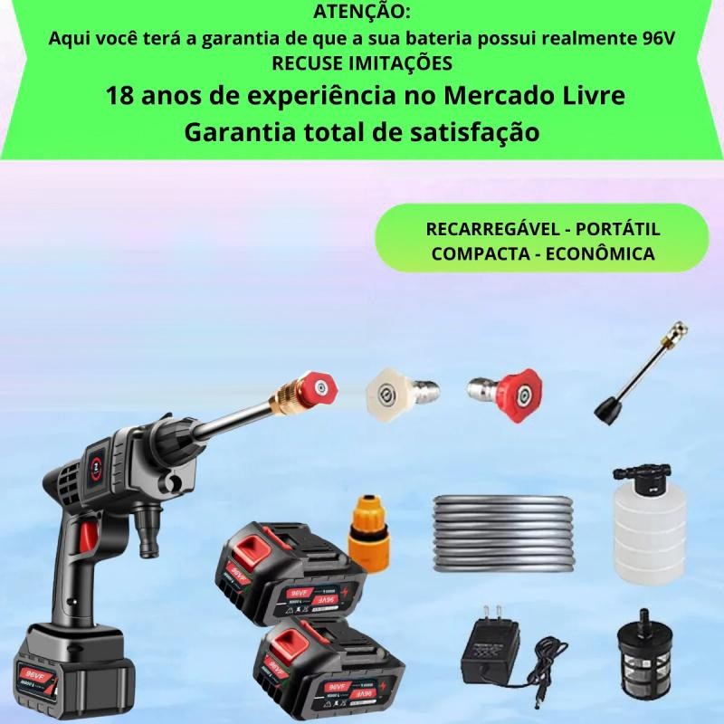 Máquina Limpeza Alta Pressão 990 PSI: Portátil (Bateria 3.0Ah), Nozzle 6 em 1. Para Carro, Pisos, Cercas, Paredes.