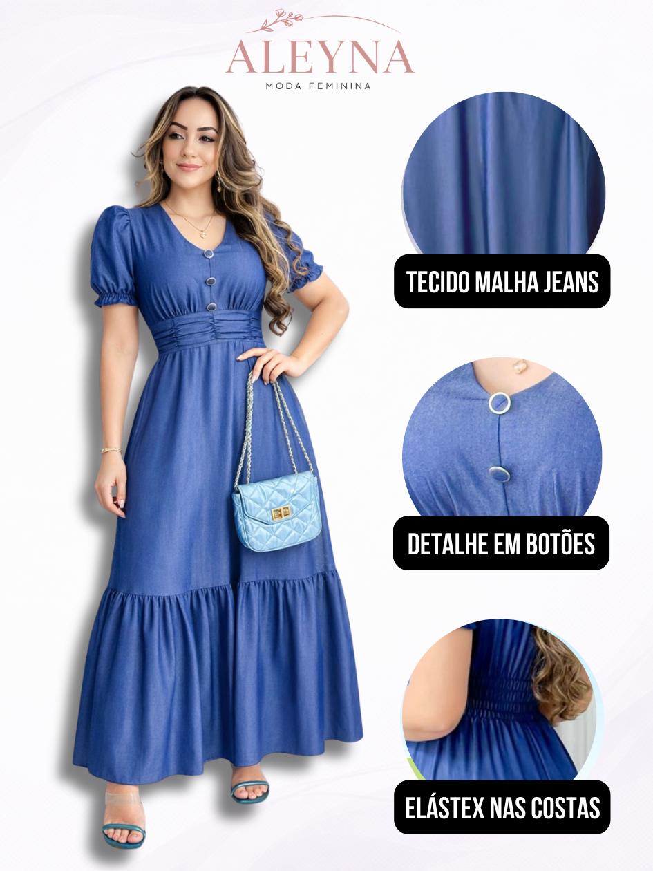 Vestido Longo Feminino Jeans Leve Manga Curta Evangélico Casual Elegante