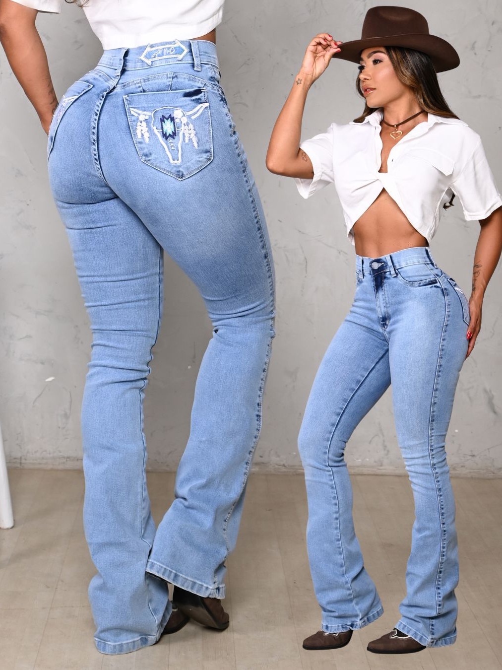 Calça Jeans Feminina Country Bordada Com Elastano Boot Coot Flare Cavalo