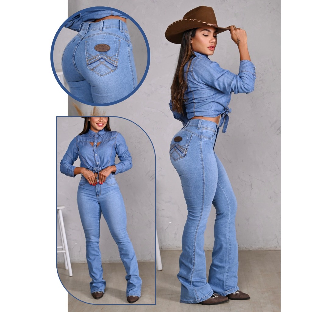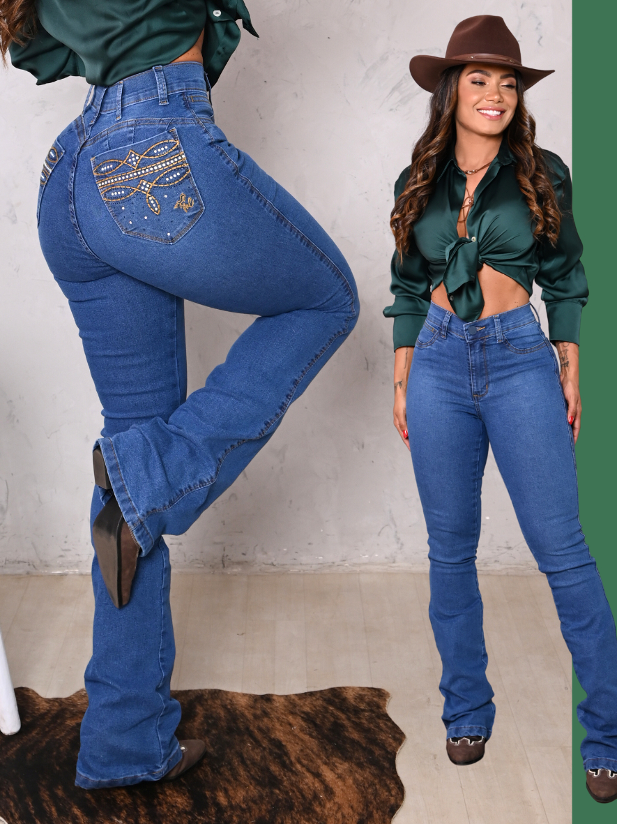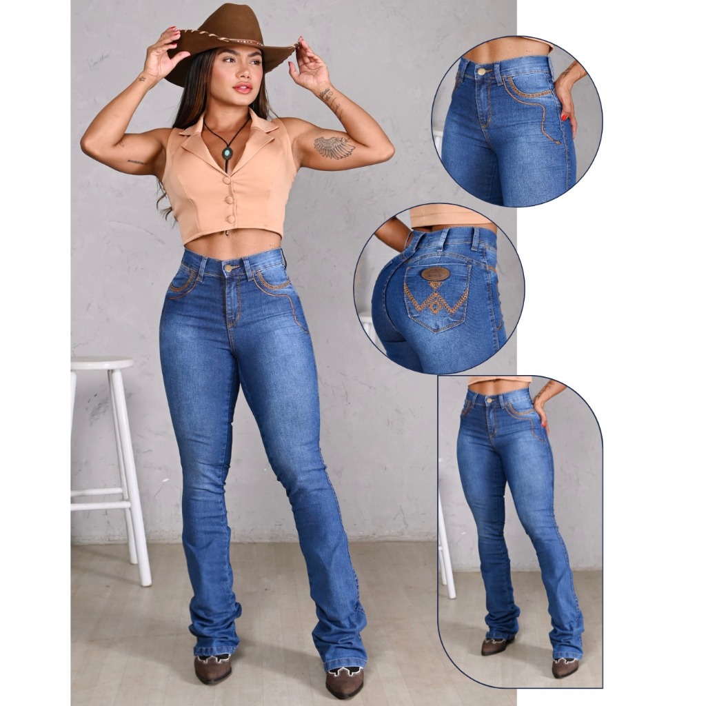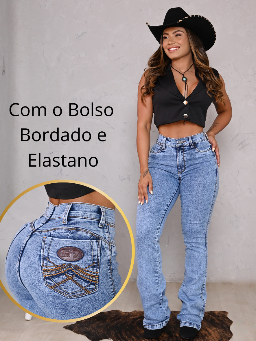 Calça Jeans Tradicional Feminina Country Com Elastano Bordada Premium Flare Boot Coot