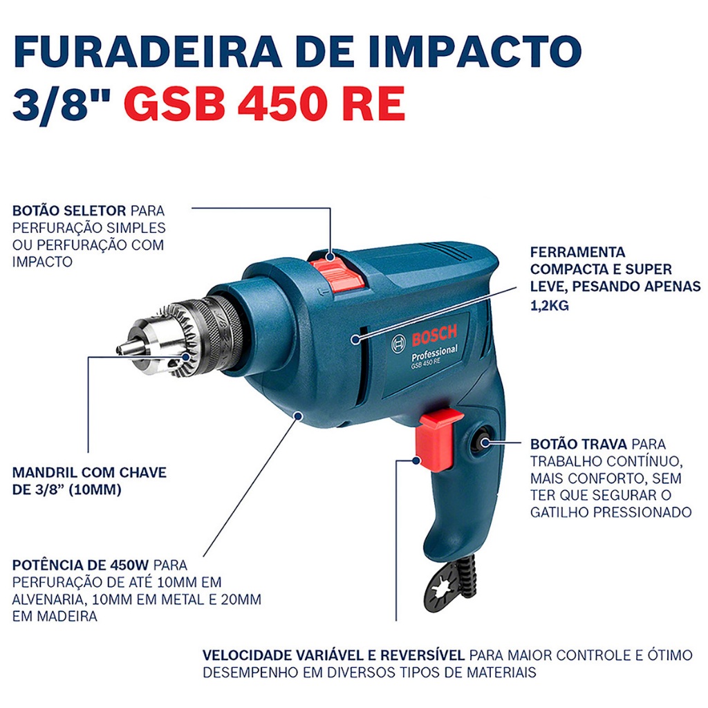 Furadeira De Impacto GSB 450 RE STD Bosch 450w + Kit Maleta Com 300 Pçs E Acessórios
