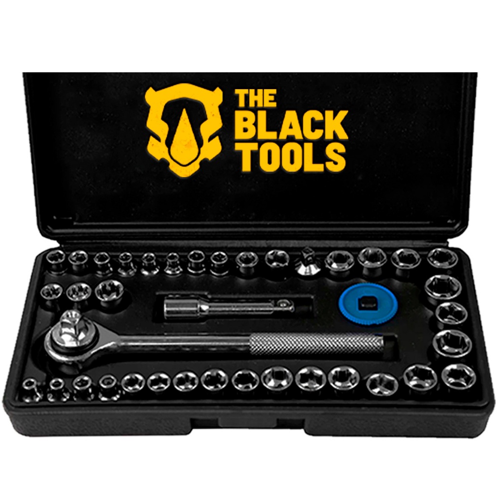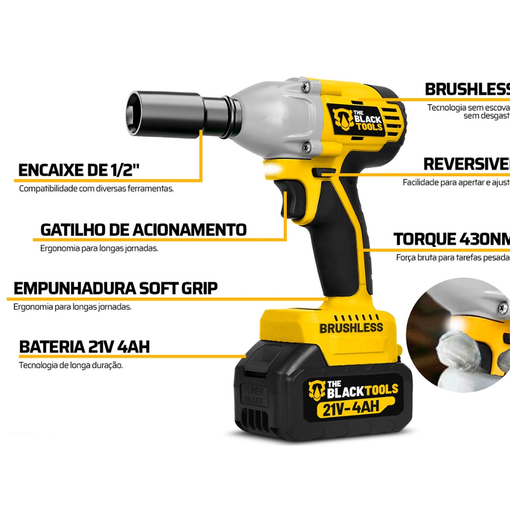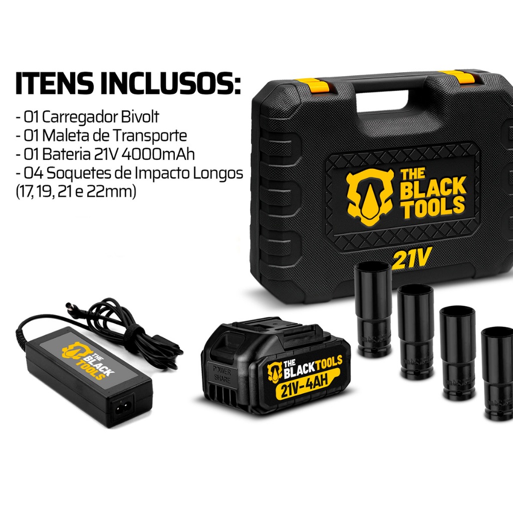 Kit Chave De Impacto Bivolt Bateria 21v Brushless TB-21I Com 40 Pçs Soquetes Chave Catraca The Black Tools + Acessórios