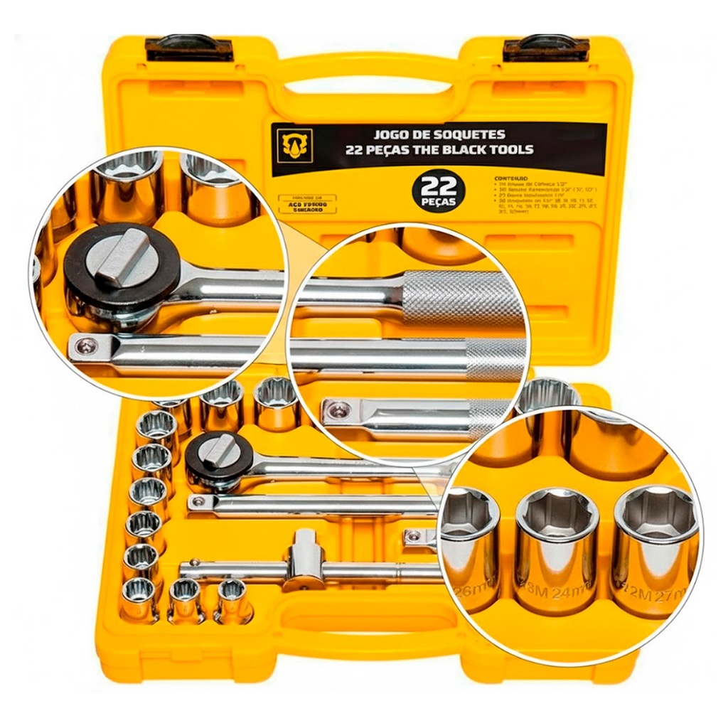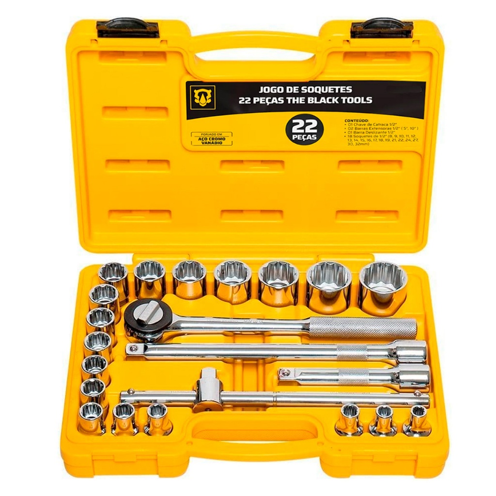 Kit Soquetes 22 Pçs Ferramentas Manuais C/ Chave Catraca 1/2 8 A 32mm Bcs022 The Black Tools