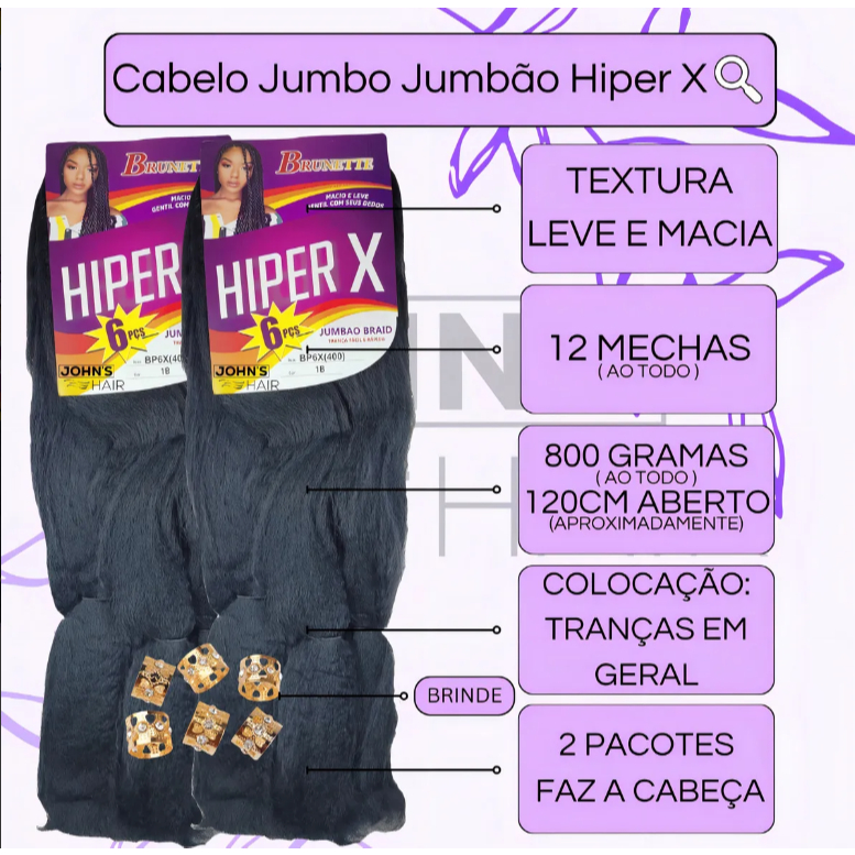 2 Pacotes Cabelo Jumbo Super Hiper X Tranças 400gr + Cor Preto #1