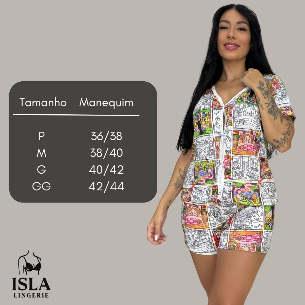 Pijama Feminino Estampado Suede Desenhos Colorir Gibi Canetinha Lavável Mulher Conforto Elegancia
