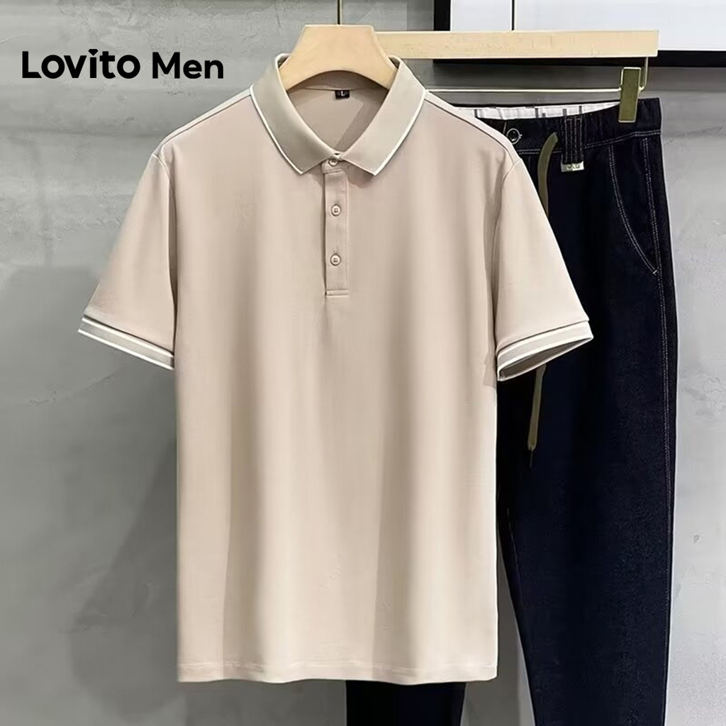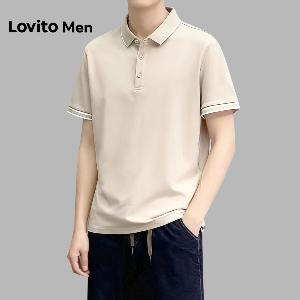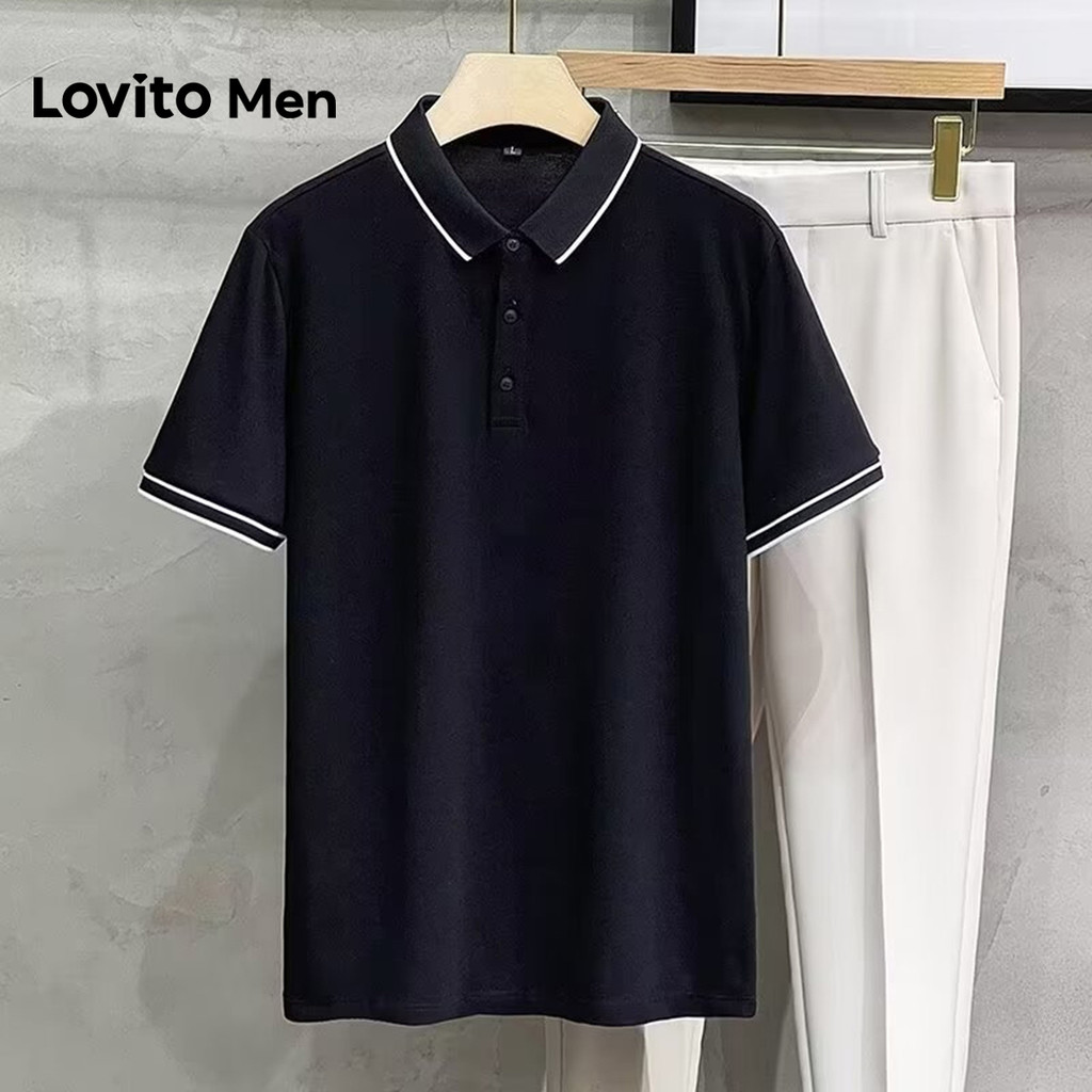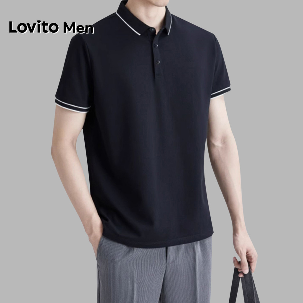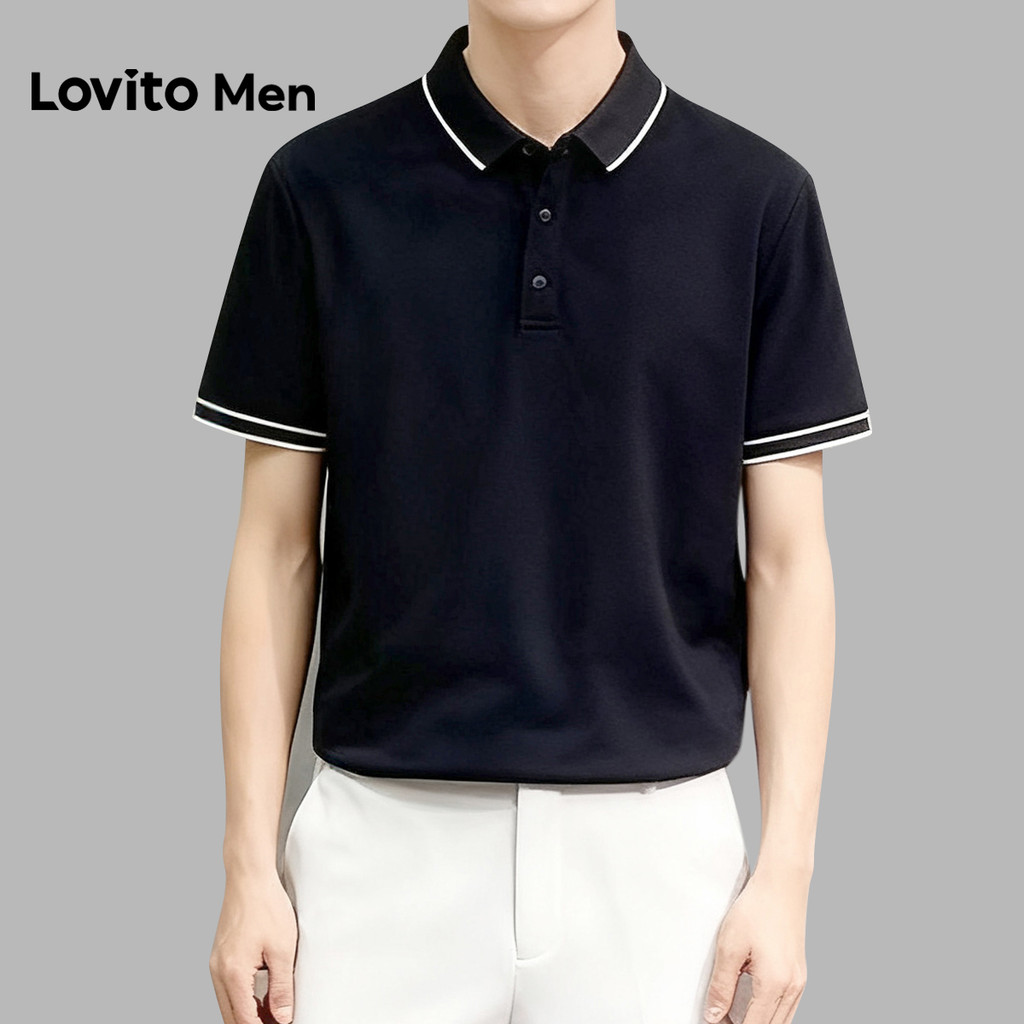 Lovito Men Camisa Polo Casual com Acabamento Contrastante Primavera/verão Polo Preta para Homens LNE127004
