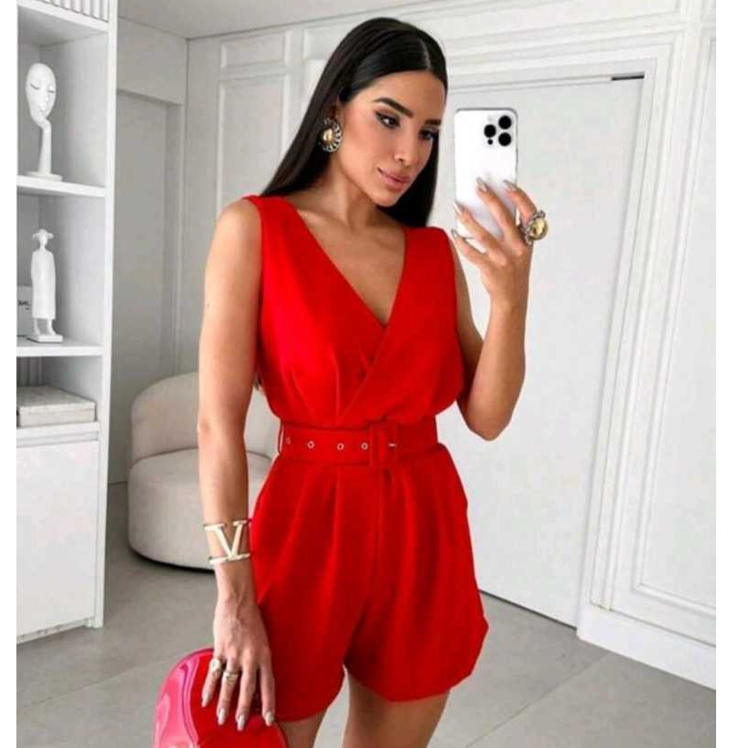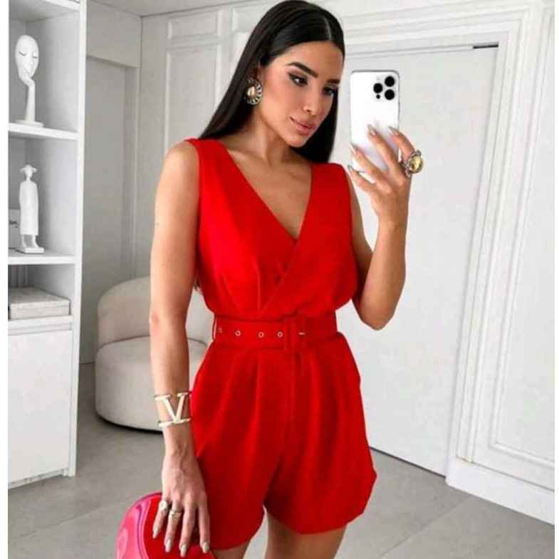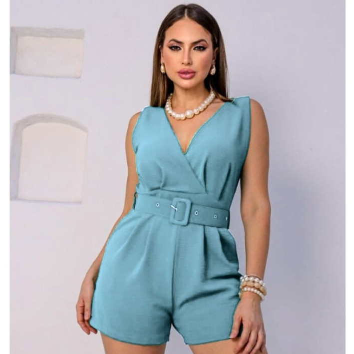 Macaquinho Curto Social Feminino Cinto Bolso Decote V Tecido Duna