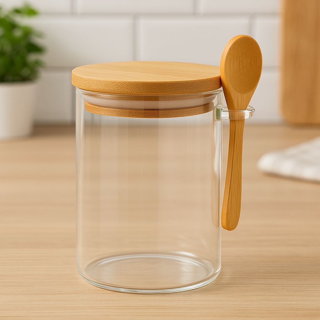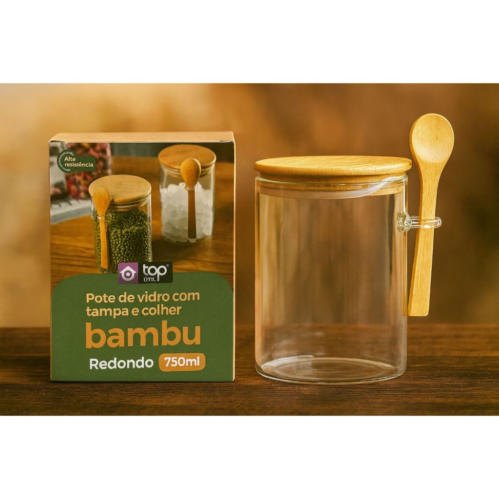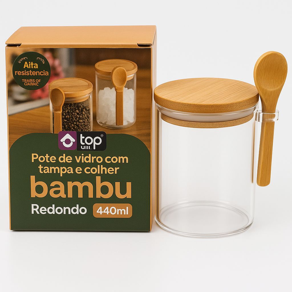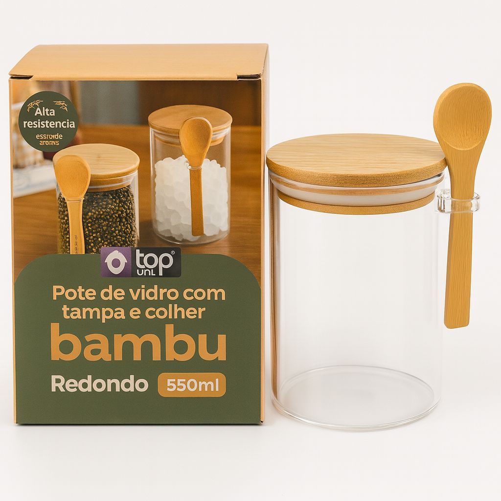 Pote De Vidro Redondo + Colher E Tampa Hermética Bambu 440ml 550ml 750ml 970ml kits