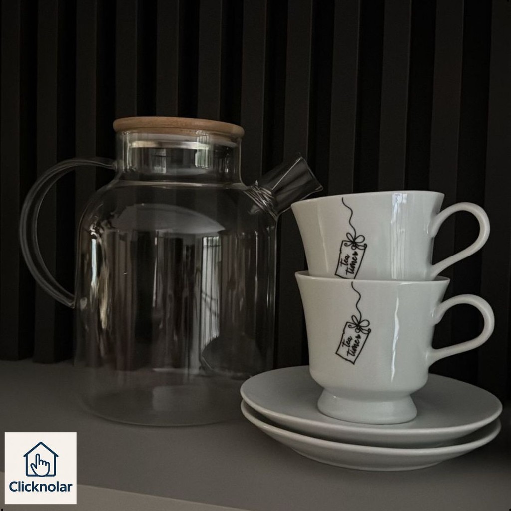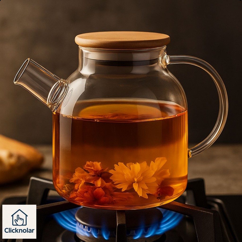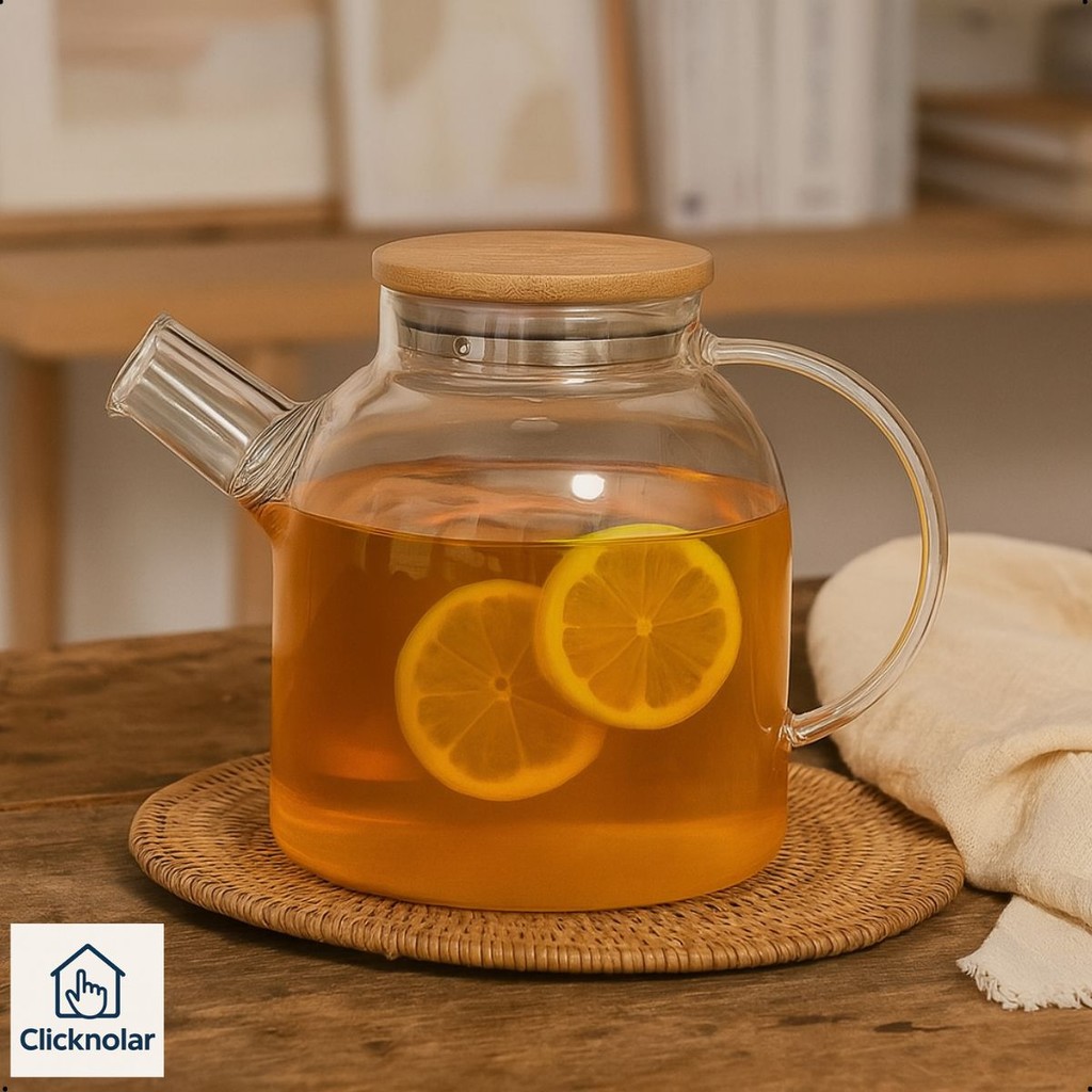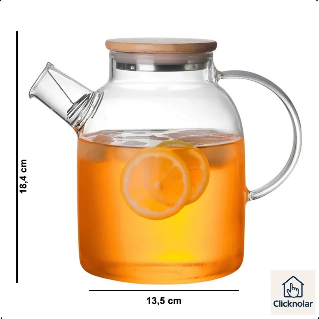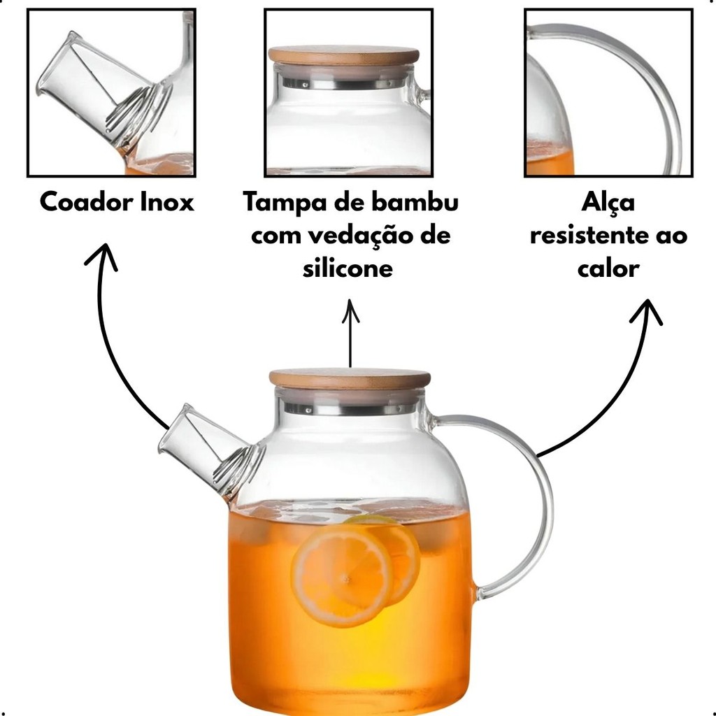 Chaleira de Vidro Borosilicato com Coador Inox para água chá e tampa de bambu - Resistente Ao Fogo