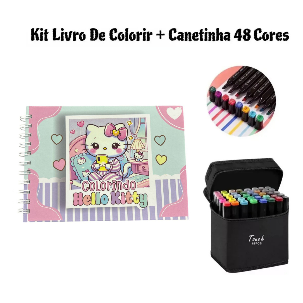 Kit Livro De Colorir Hello Kitty + Canetas de colorir touch C/48 Cores
