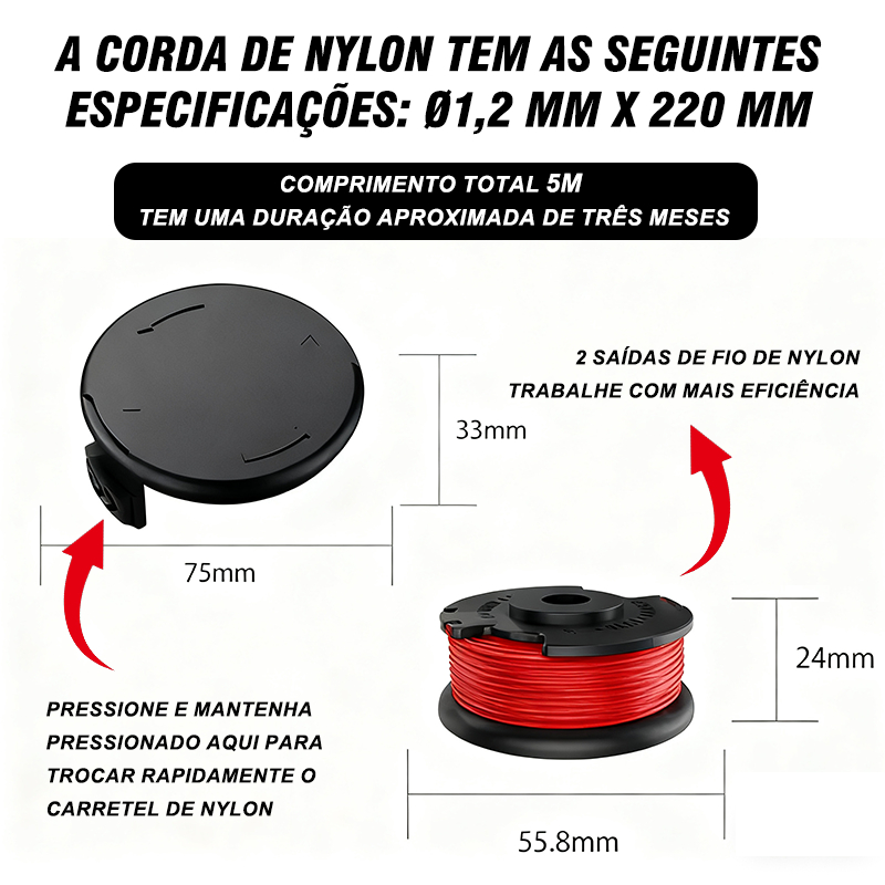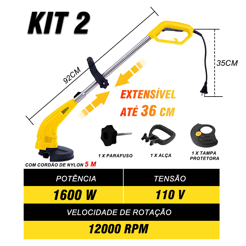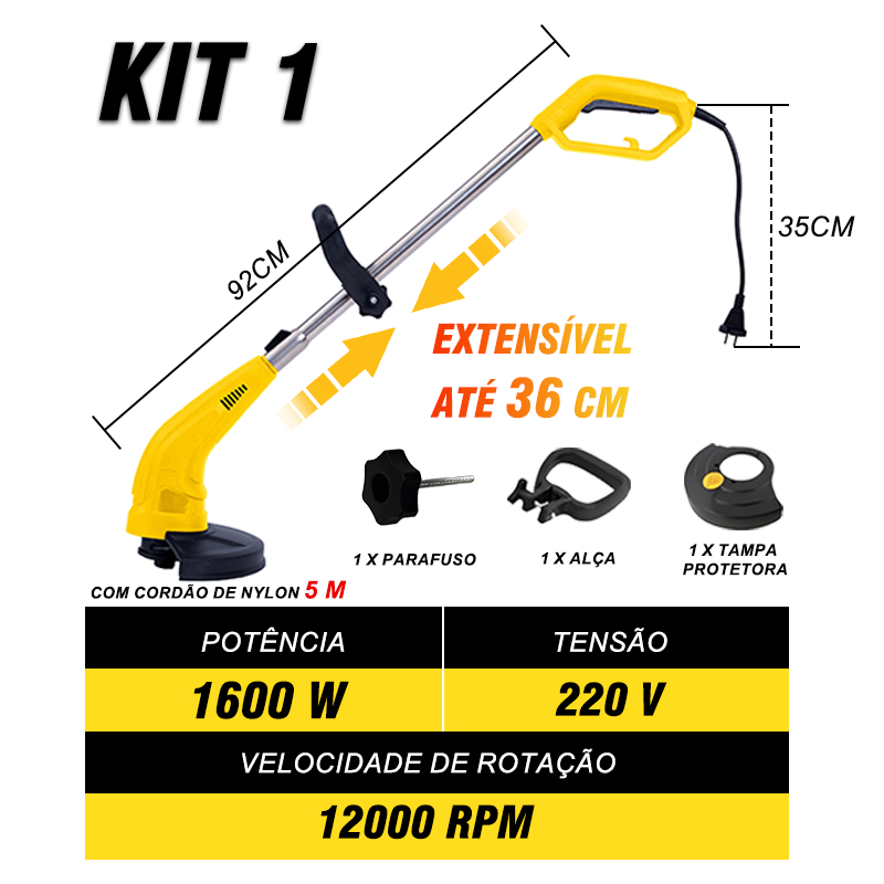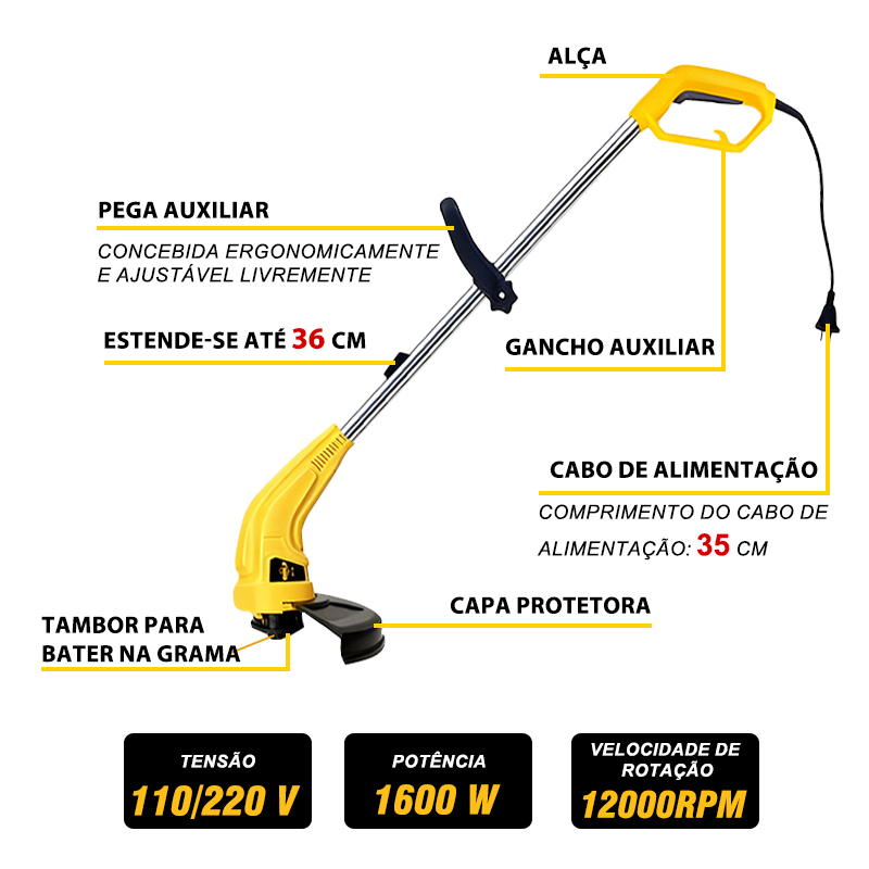 Aparador de grama eletrico 1.600 watts cabo bipartido 110V/220V - 2 Saídas de Fio de Nylon