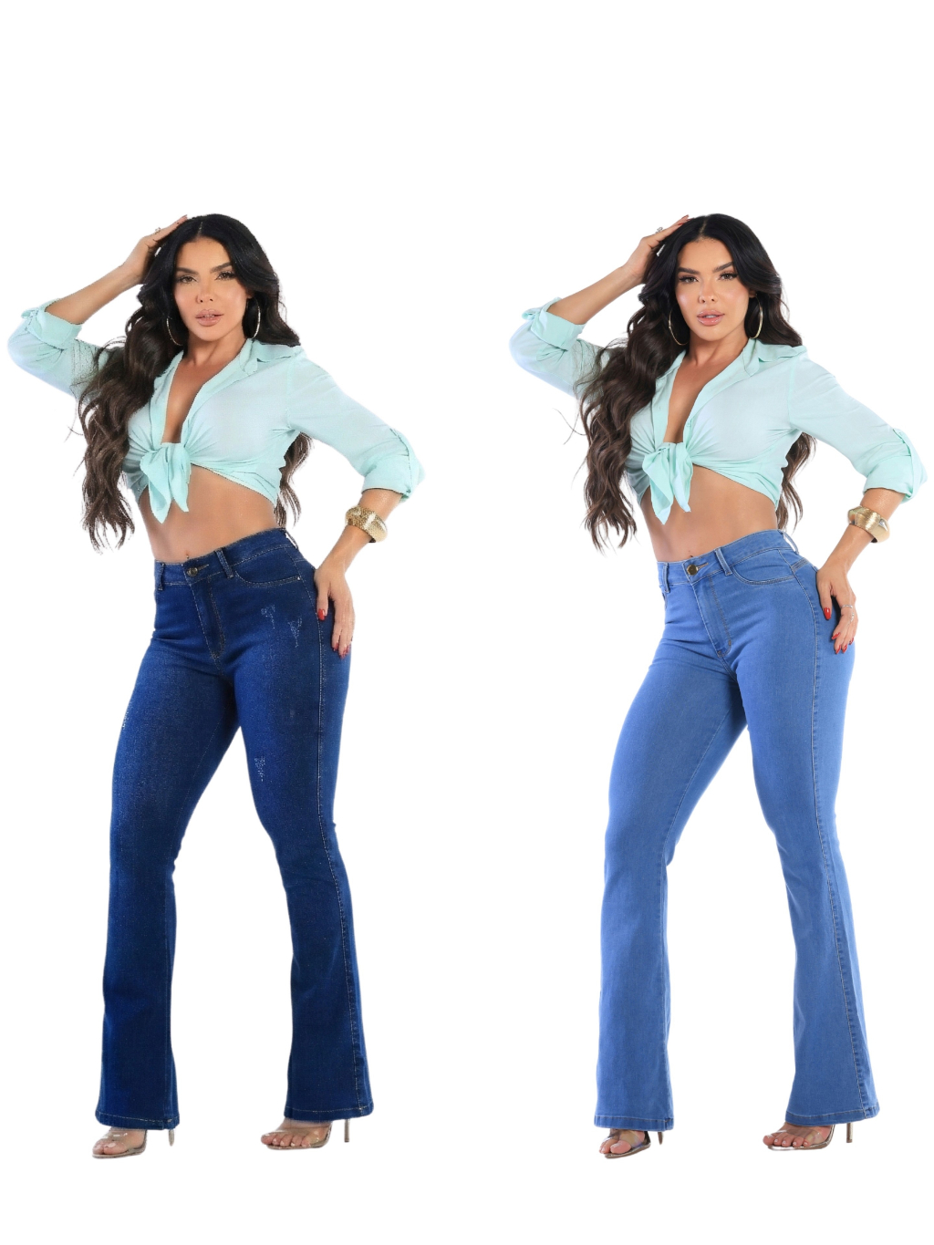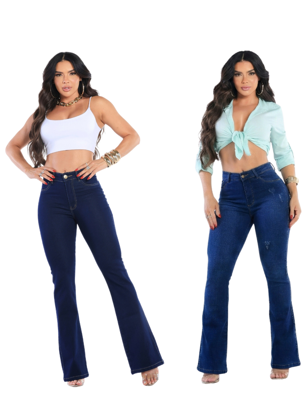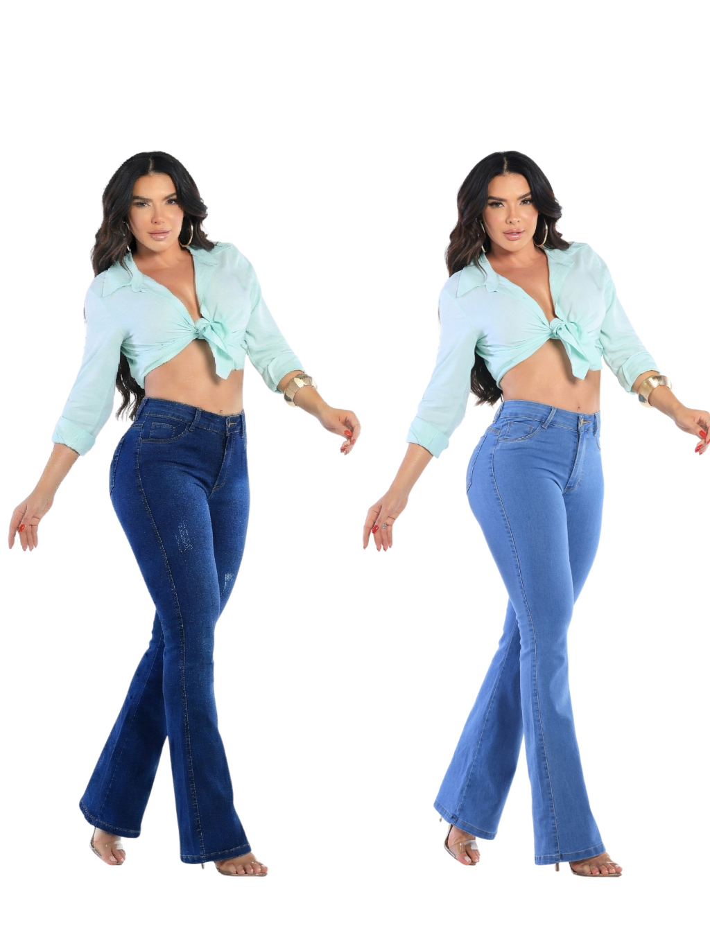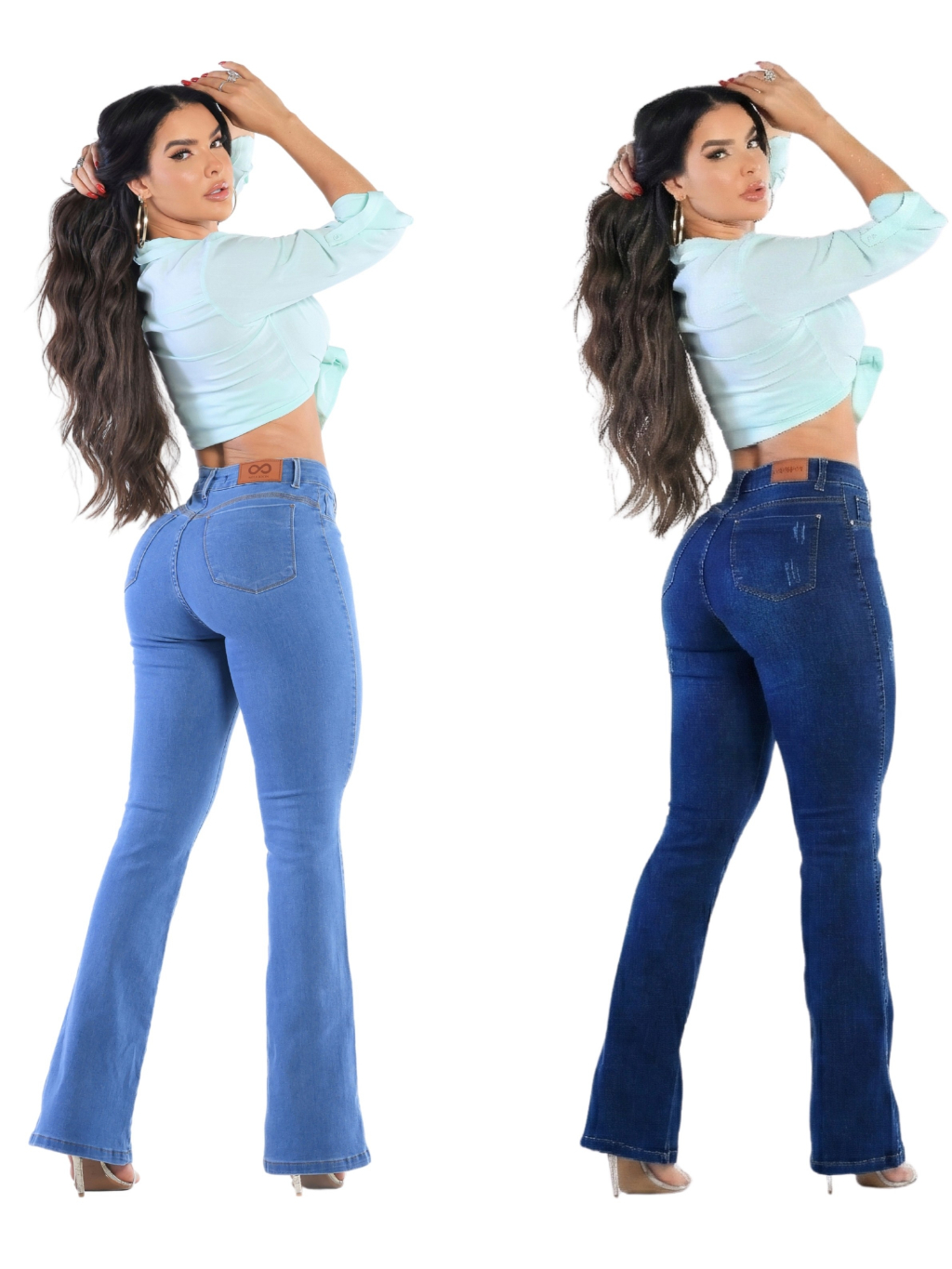 Kit 2 Calças Jeans Feminina Flare Levanta Bumbum Cos Alto Com Lycra Boca De Sino