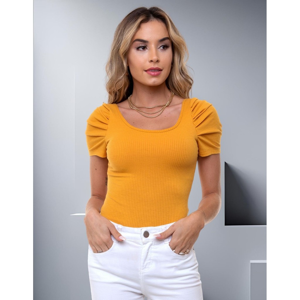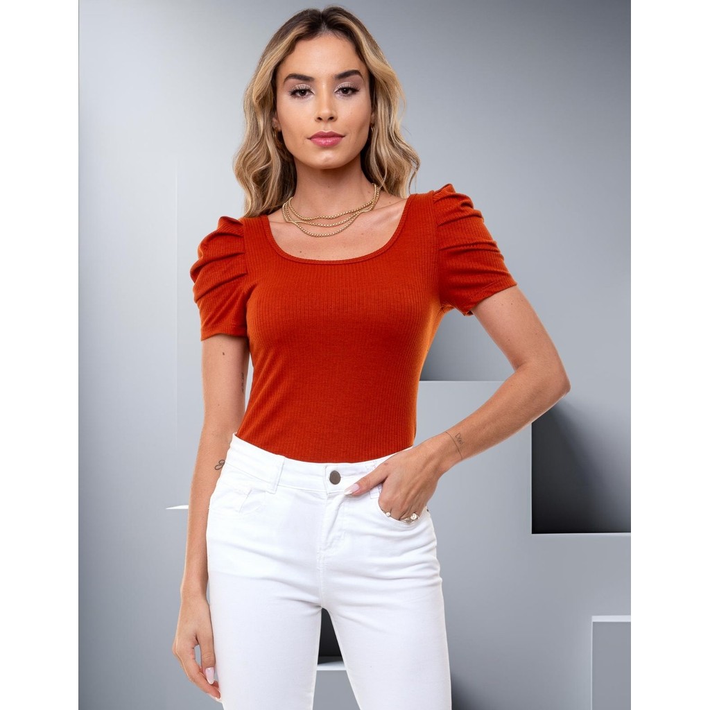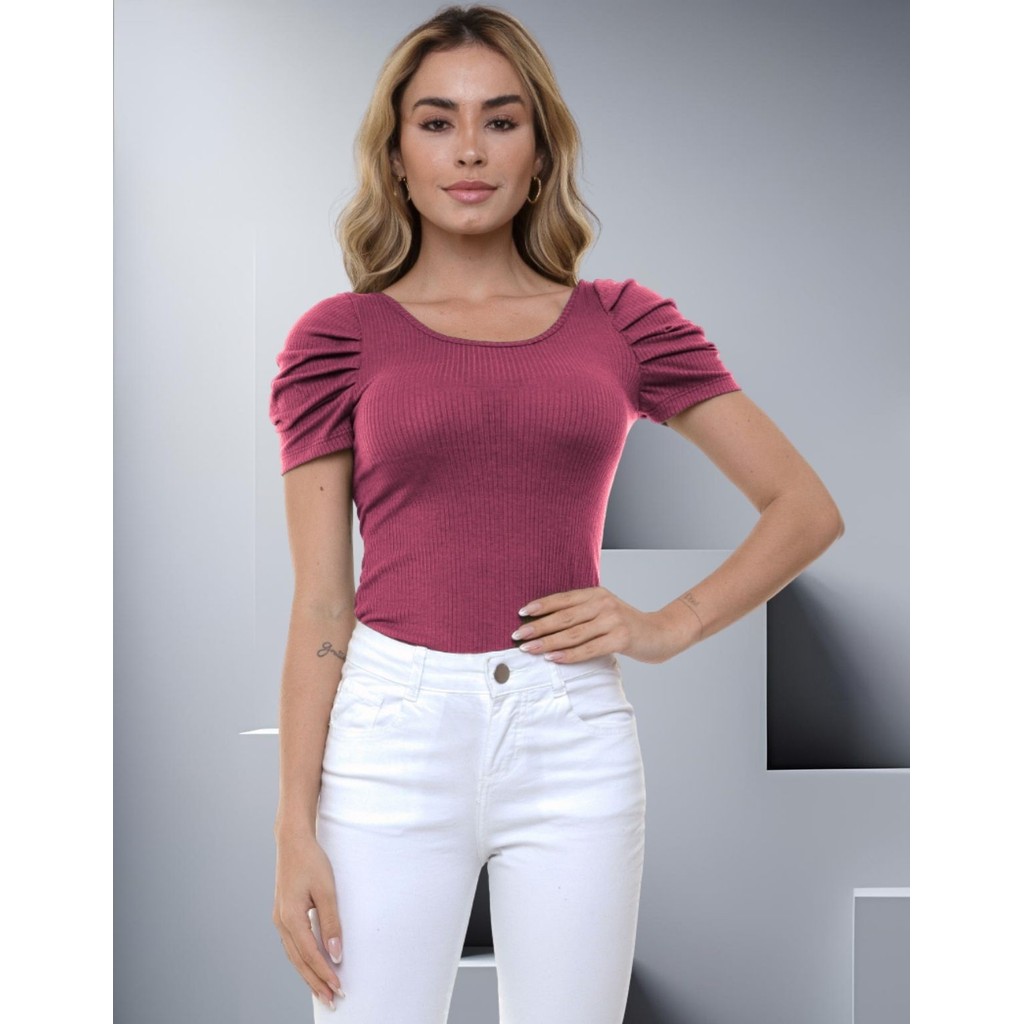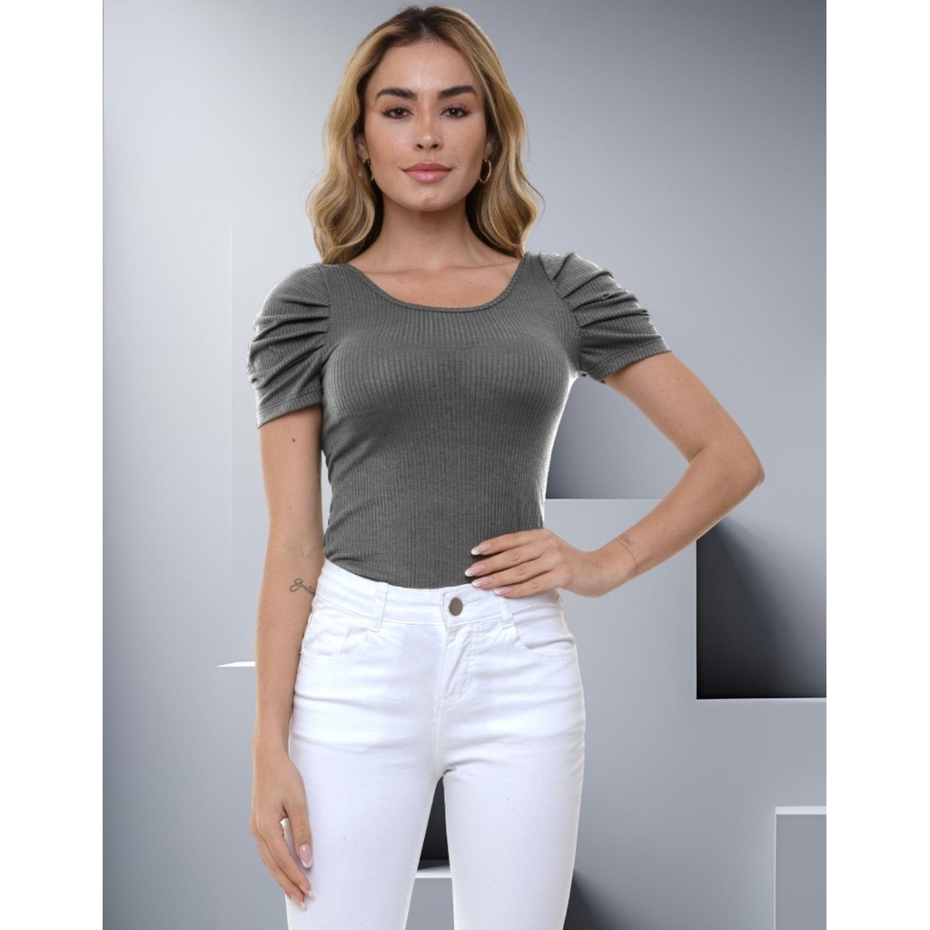 Body Canelado Manga Curta Princesa Bufante Blusinha Feminina Básica Modinha Casual Minimalista