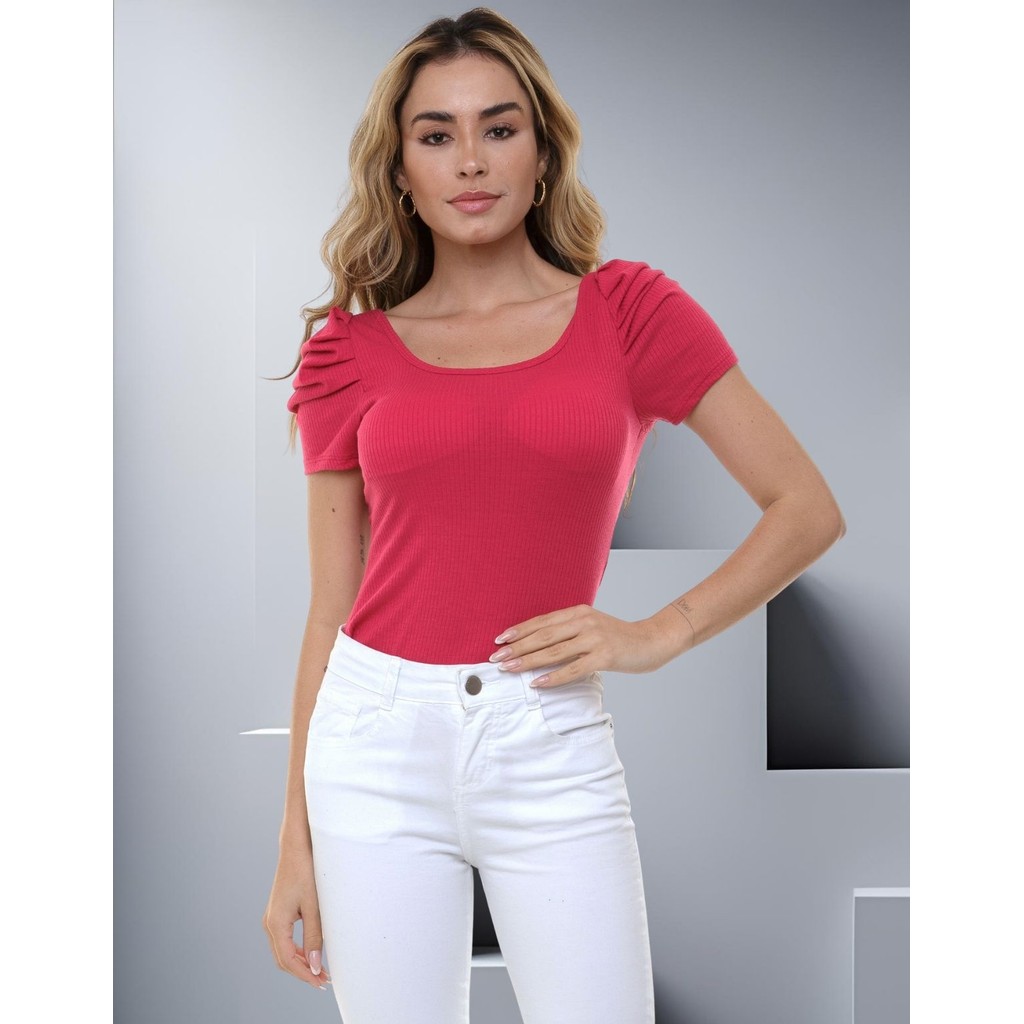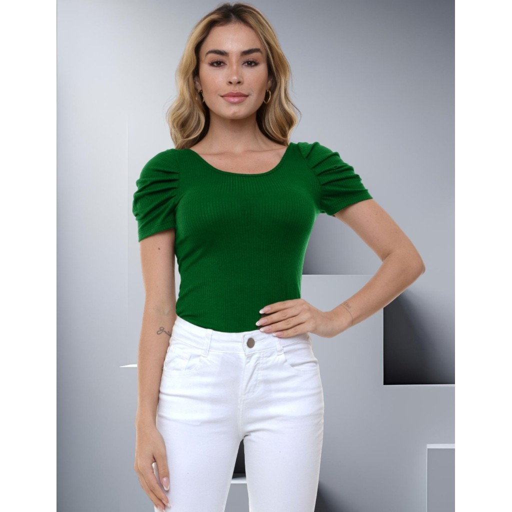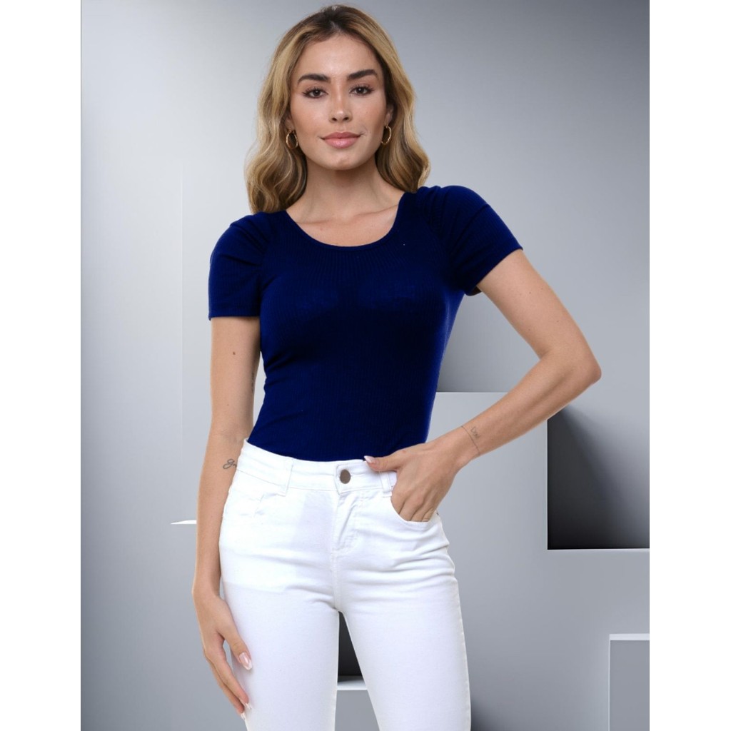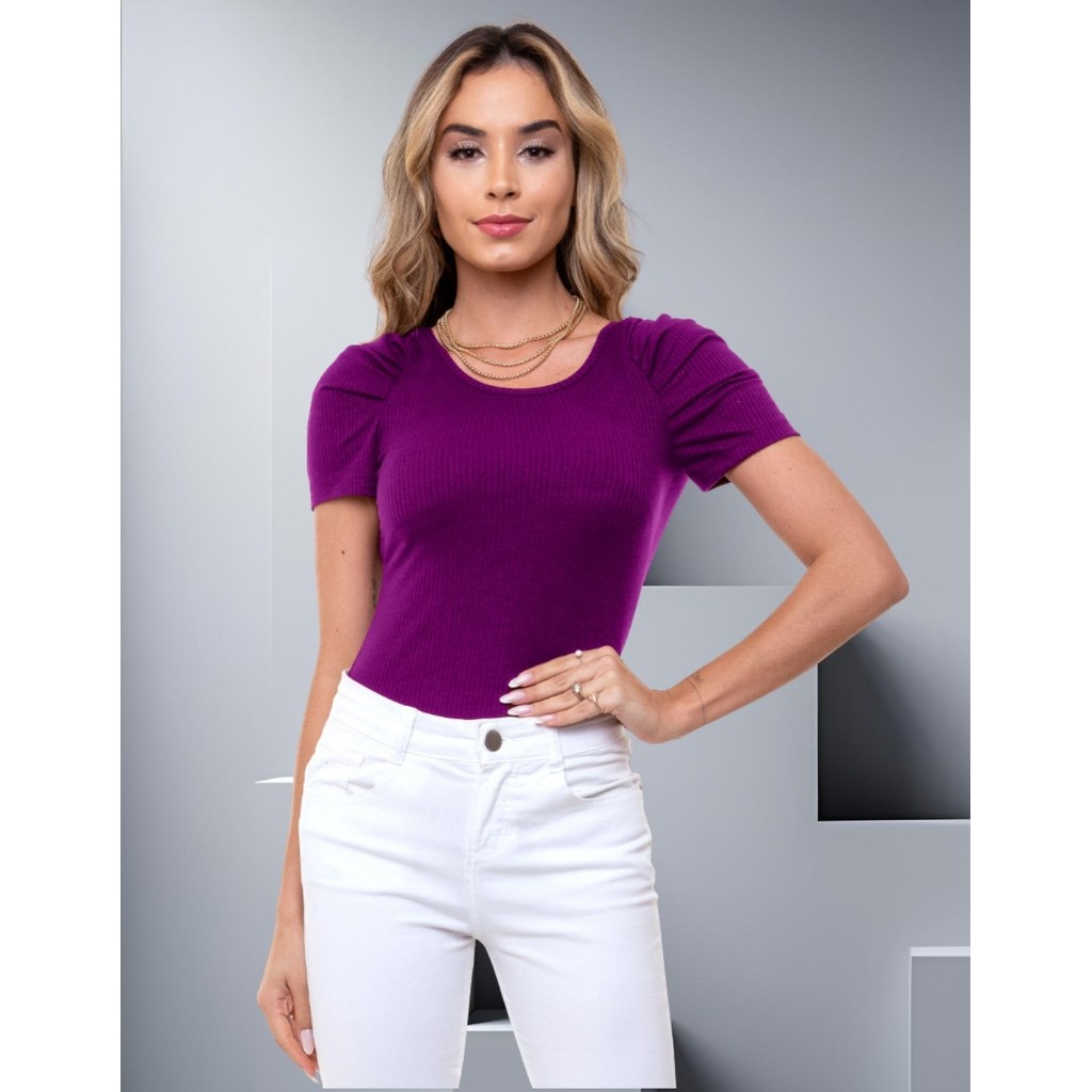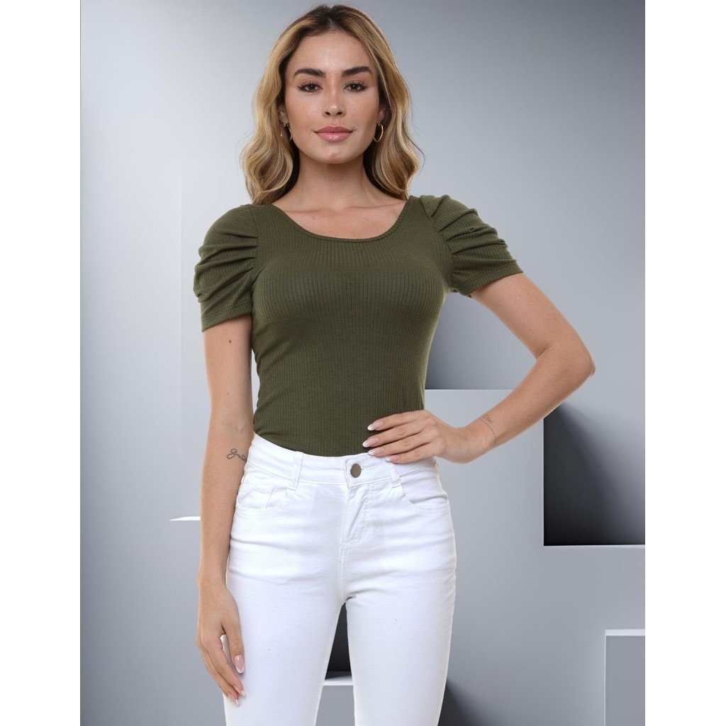 Body Canelado Manga Curta Princesa Bufante Blusinha Feminina Básica Modinha Casual Minimalista