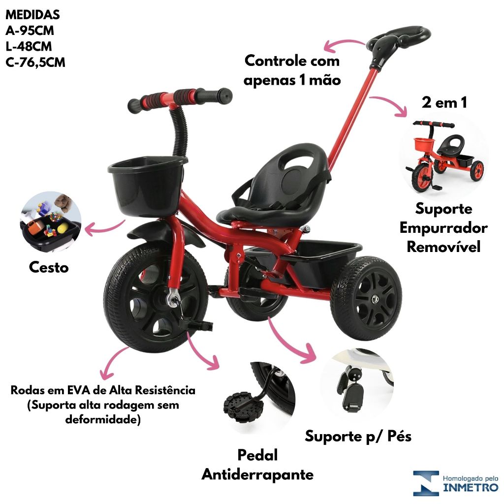 Triciclo Infantil 2 em 1 Vermelho C/ Empurrador 30kg