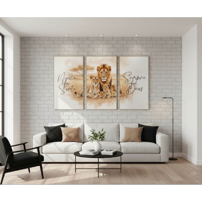 Kit 3 Quadro Decorativo Família Leão "Nunca Foi Sorte, Sempre Foi Deus" Fé Bíblia até 120x60 Quarto Sala