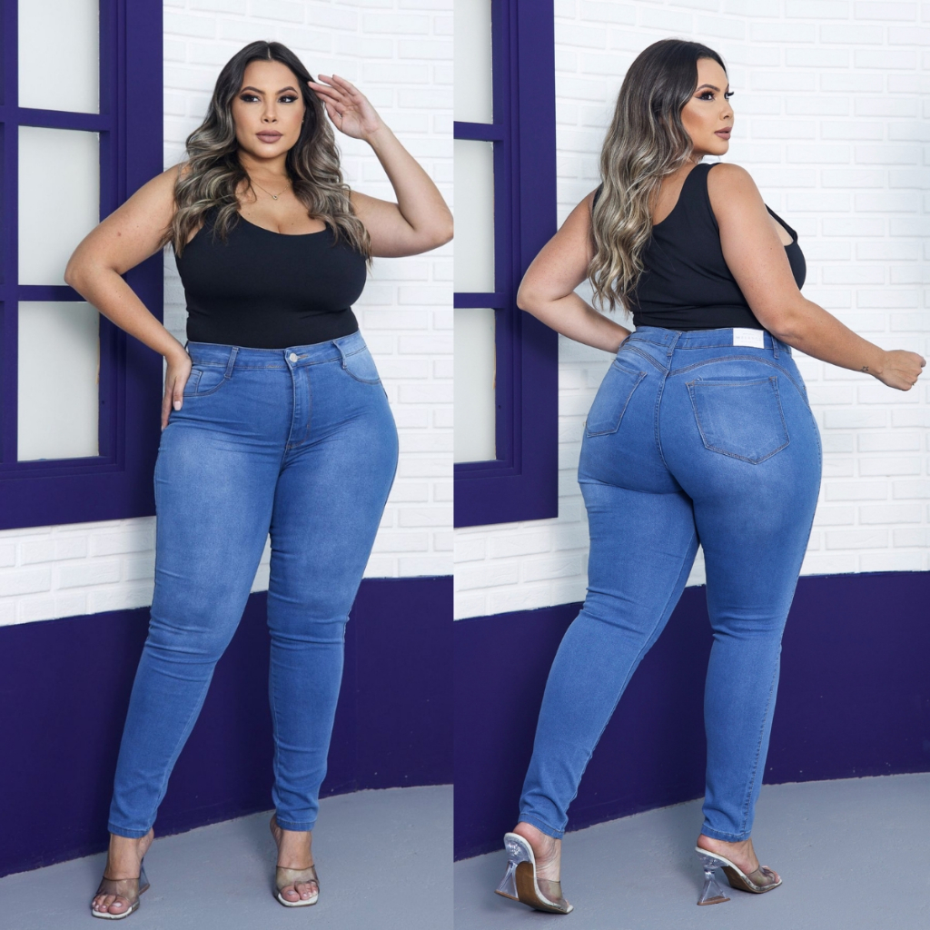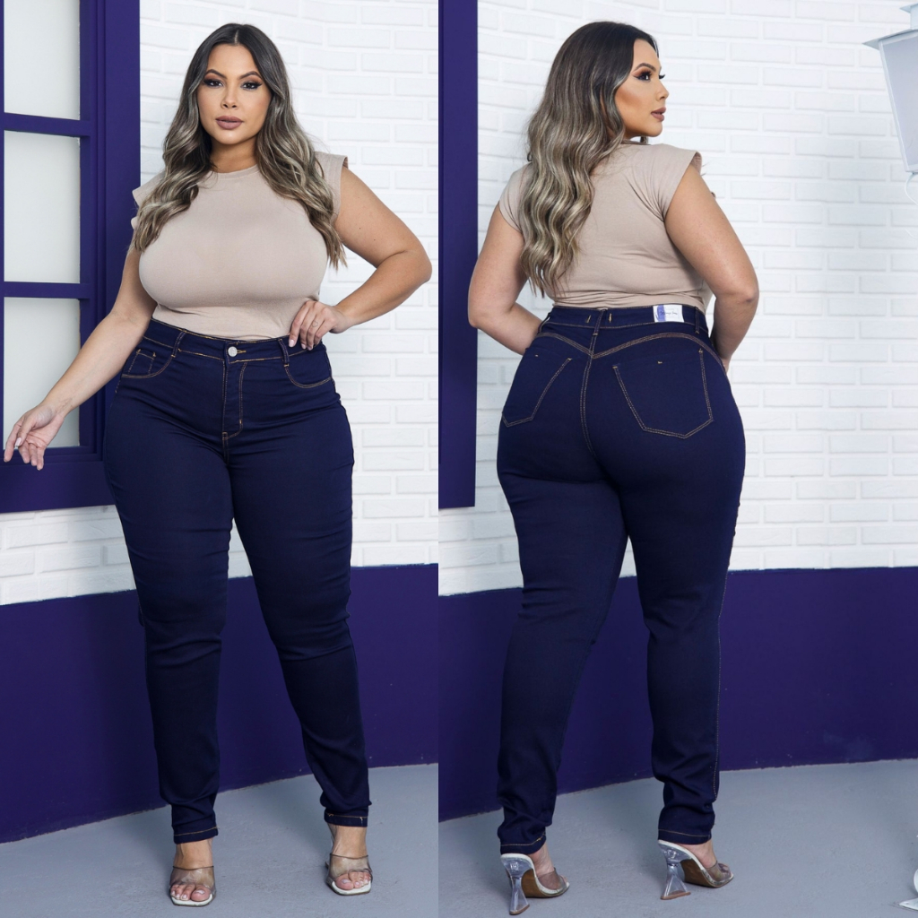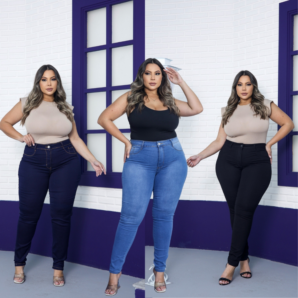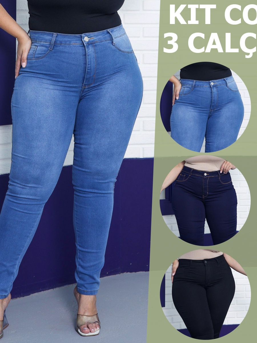 Kit 3 Calças Jeans Plus Size Skinny Feminina Cintura Alta Modelador Corte Justo Confortável Casual