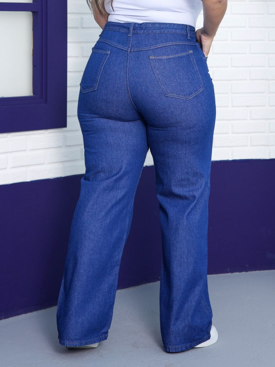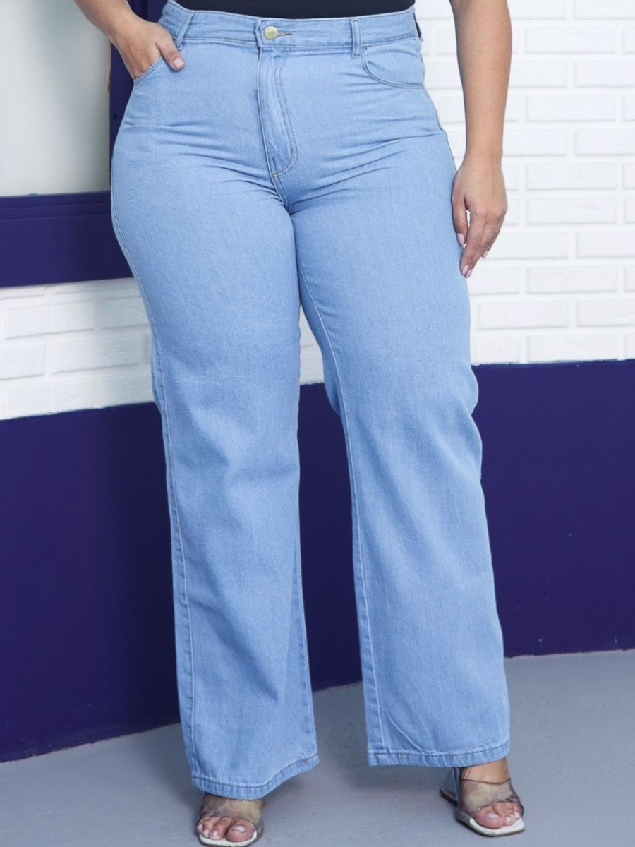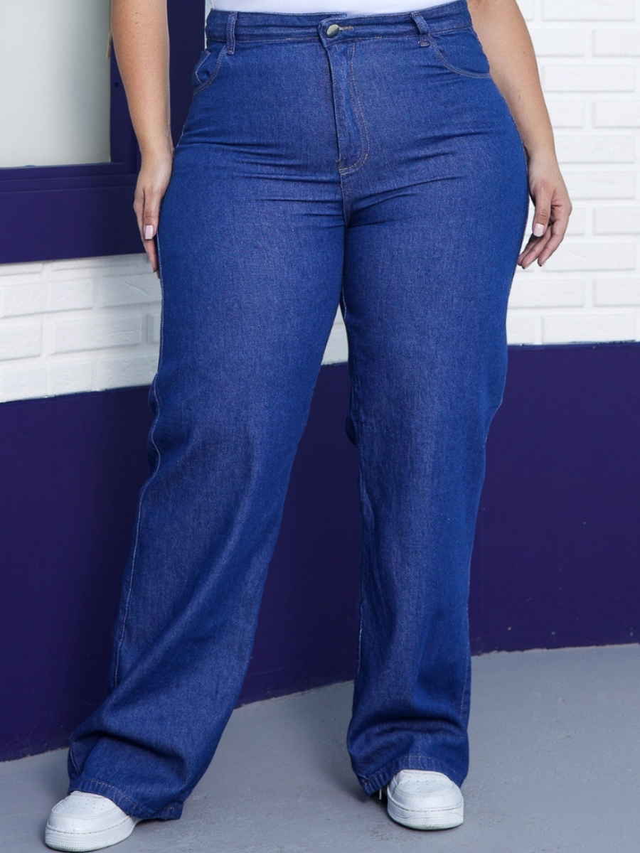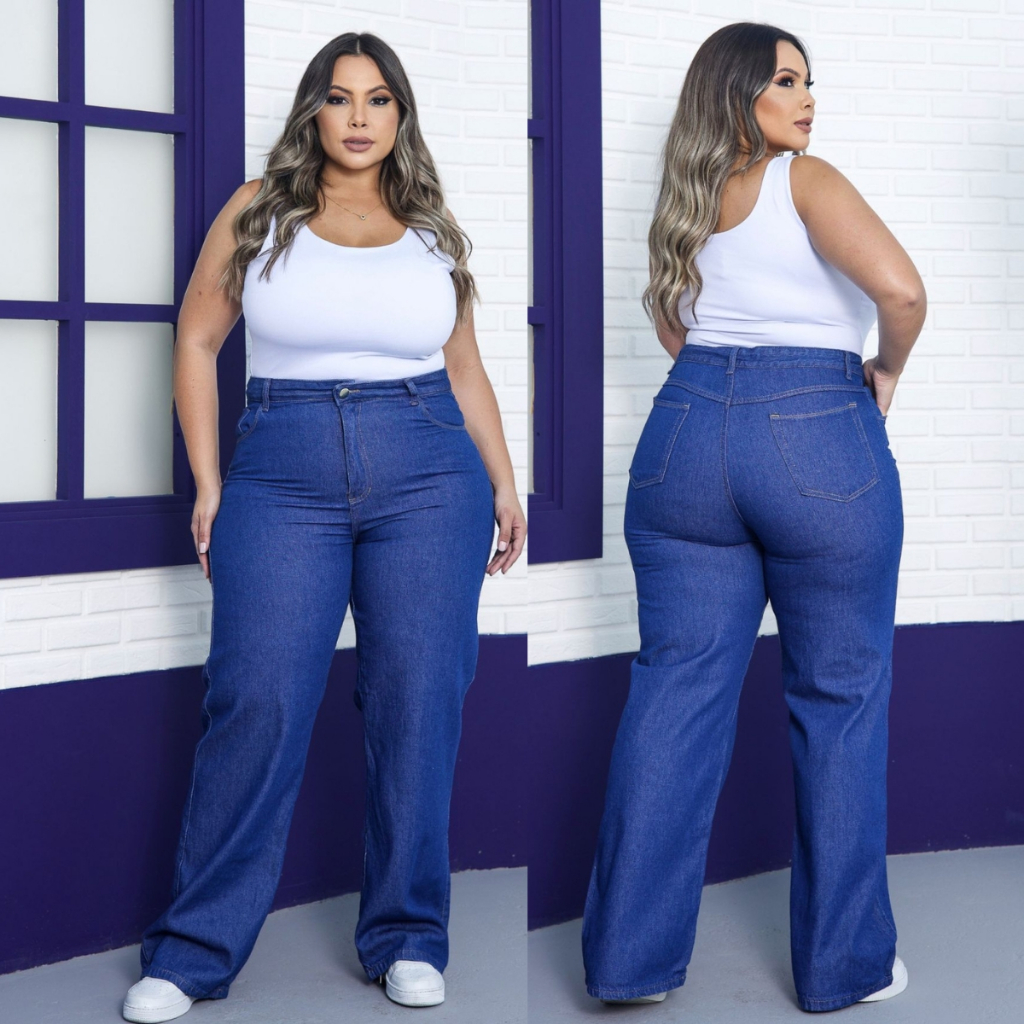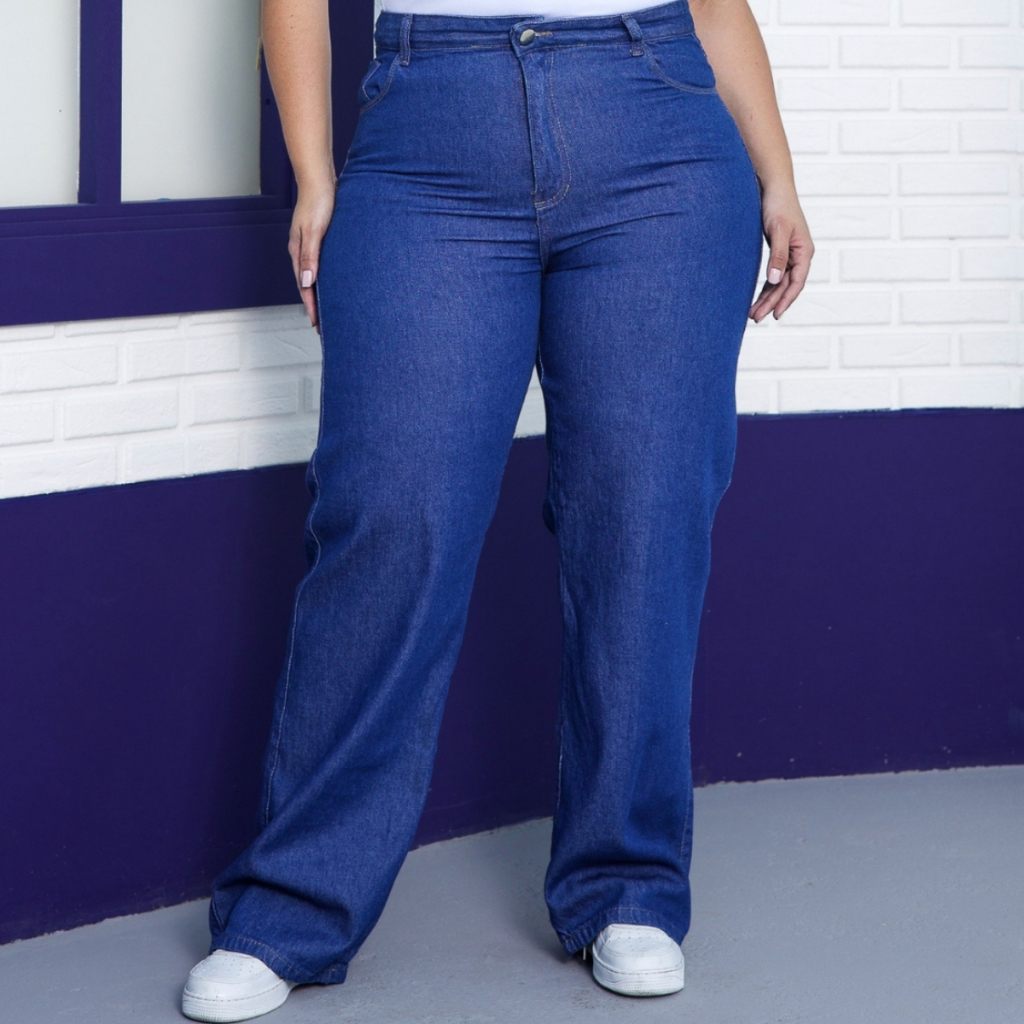 Calça Wide Leg Plus Size Jeans Feminina Cintura Alta Pantalona Moda Casual